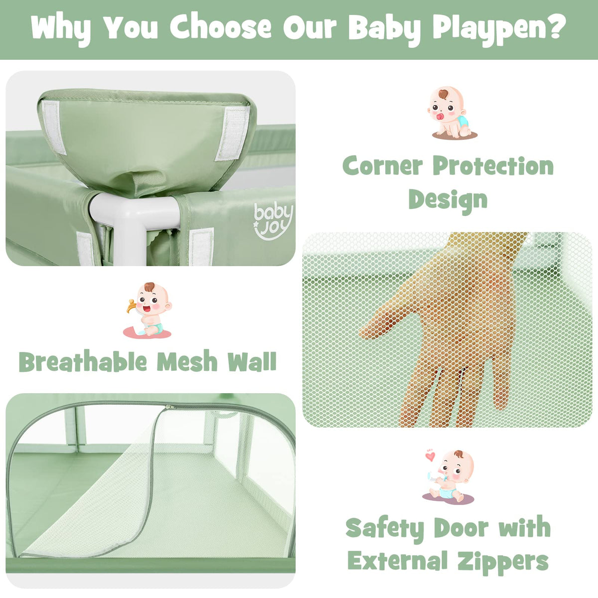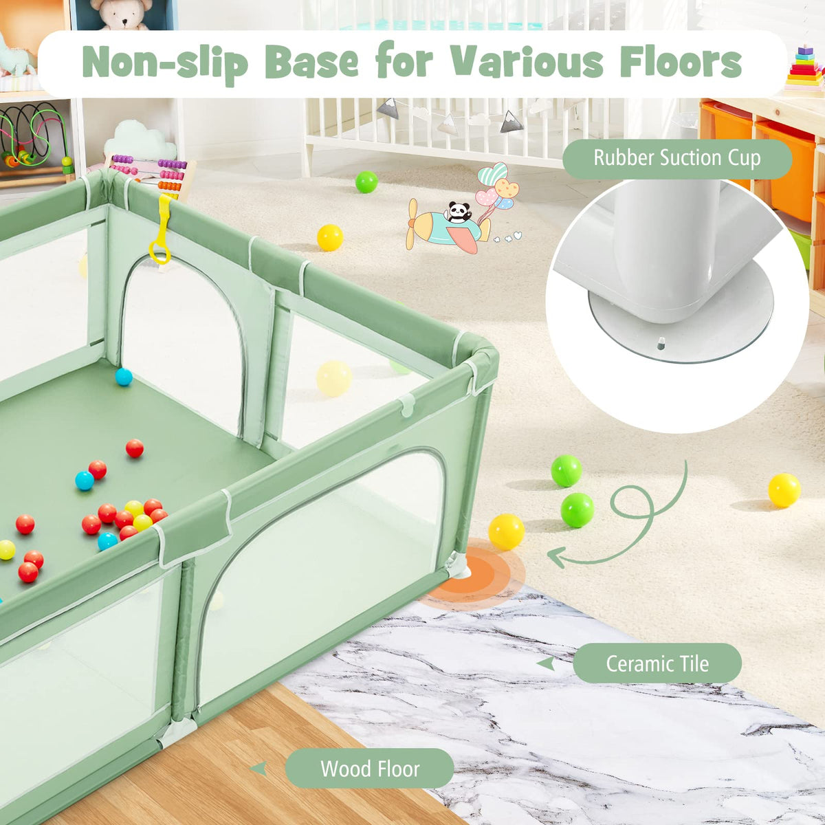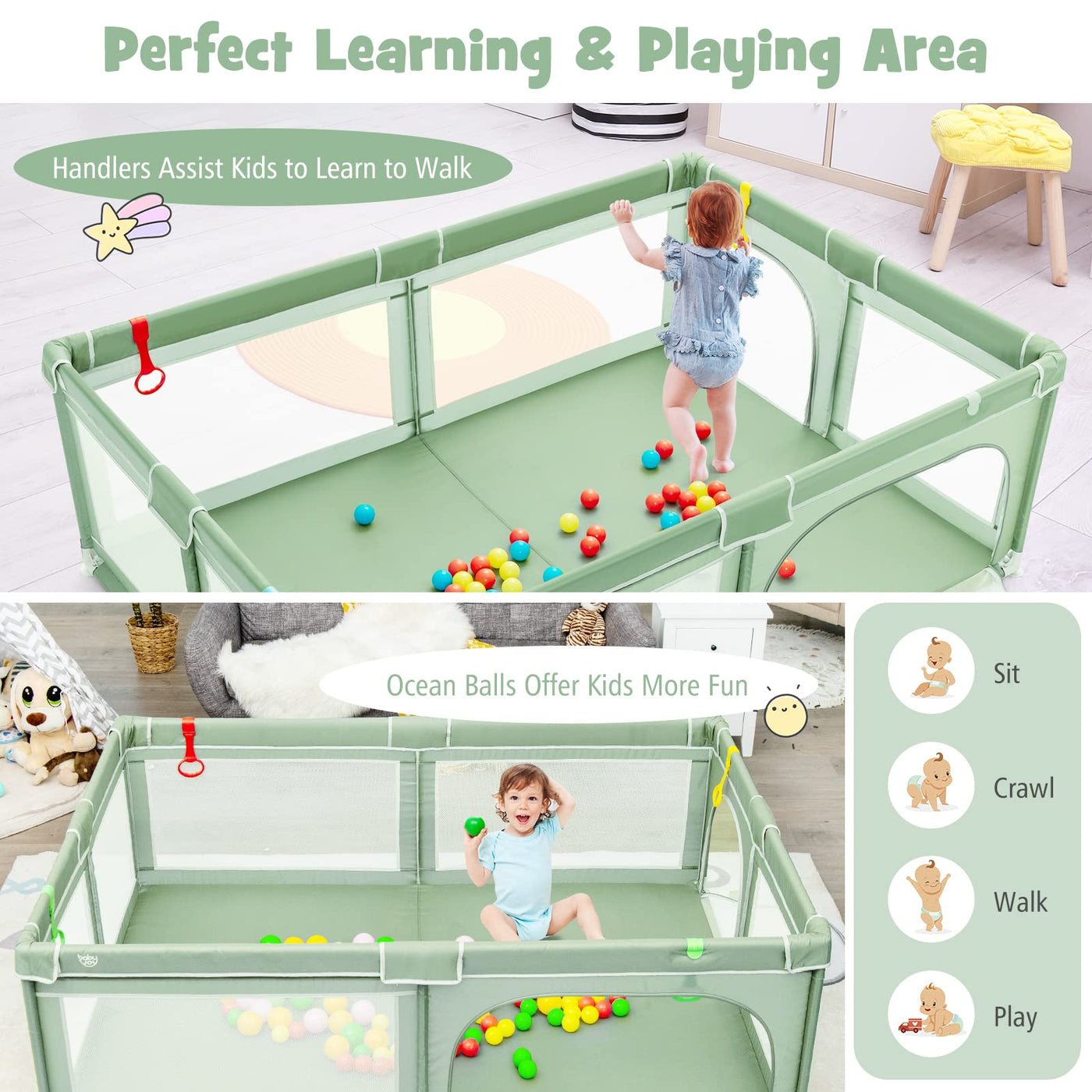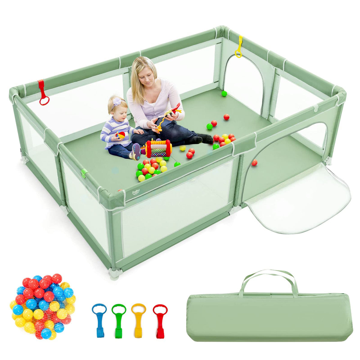Description:Are you looking for something to make baby stay in a safe zone and free your hands? Our baby playpen is exactly what you need.Our baby playpen has a playing area of 81(L) x 59(W) for kids to learn and play safely. 4 handlebars and 27 height panels help kids to learn to stand and walk. 50 ocean balls bring kids much more fun. Besides, oxford fabric and soft sponge make it a safe and cozy zone. To ensure more security, we specially design it with a breathable mesh wall, a safety door with external zippers, and a corner protection design.Moreover, Solid steel pipes, premium PP connectors, and rubber suction cups help it to stay stable on the ground. And with a carrying bag, its easy to carry and store. Furthermore, a detailed user manual makes it easy to assemble.Features:81(L) x 59(W) baby playpen for kids to freely sit, crawl, walk or play27 height panel allows babies to learn to stand and walkIncludes 1 carrying bag, 4 handlebars, and 50 ocean ballsPremium oxford material for high durabilitySoft sponge allows for more comfortASTM certification guarantees high quality of playpenVisible mesh wall enables parents to better interact with their toddlersSafety door with external zippers prevent babies accidental climbing outSolid steel pipes and non-slip foot mats keep it stable and sturdyEasy to carry and assemble, saving your time and energySpecifications:Color: Gray/Black/GreenMaterial: Oxford Fabric + PP + SteelProductDimensions:81 x 59 x 27 inch (L x W x H)NetWeight:16 lbs