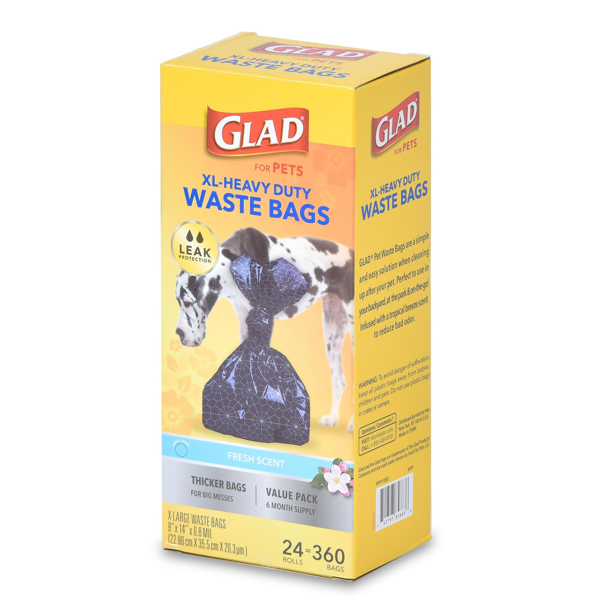 Glad For Pets Waste Bags, Dispensers, And Training Pads Are Dependable And Specially Designed For Easy Clean Up! Built With Glad Level Strength, Everyday Training And Clean Up Accessories Bring Innovation To Each Stage Of Your Dog'S Life, From Training Pads Using Activated Carbon Technology, To Daily Waste Bags With Dispensers. With Glad For Pets Extra Large, Heavy Duty Scented Dog Waste Bags Refills, You'Ll Never Be Left In A Lurch Without A Poop Pick Up Solution When Out With Your Pet Or Pets! These Heavy Duty Doggy Bags Are Thicker And More Tear Resistant Than Standard Dog Bags, So You Can Trust The Leak Proof Protection Of Glad. Cleaning Up After Your Dog May Not Be Fun, But Glad For Pets Makes It Super Easy To Be A Responsible Owner. These Bags Are Infused With Fresh Scent To Make Poo Pick-Up More Pleasant. These Doggie Bags For Poop Are Perforated, Making It Easy To Grab One Quickly! These Dog Waste Bags Will Also Help You Clean Up Quickly After Fido Has Done His Business. Pick It Up And Toss It In The Trash. It'S That Easy! Whether You'Ve Had A Pet For A While, Or Are Just Meeting Your New Dog For The First Time, These Unscented Dog Poop Bags Are Must Have Dog Supplies. These Poop Bags Are Made From Heavy Duty Material For Ultimate Holding Power And Sanitary Poop Pickup. Each Waste Bag For Dogs Measures 9X14 Inches. This Pack Of Doggie Pickup Bags Includes 24 Rolls, Totaling 360 Bags. Using These Waste Bags Is As Simple As Can Be! 1. Take The Glad Waste Bag And Pull It Over Your Hand Like A Glove. 2. Pick Up Waste With Your Bagged Hand. With Your Other Hand, Grasp Open End Of The Bag And Pull It Inside Out. The Waste Will Now Be Inside The Bag. 3. Gently Tie And Knot The End Until Completely Closed. Dispose Of Safely. Safety Warning: To Avoid Danger Of Suffocation, Keep All Plastic Bags Away From Babies, Children And Pets. Do Not Use Plastic Bags In Crates Or Carriers.