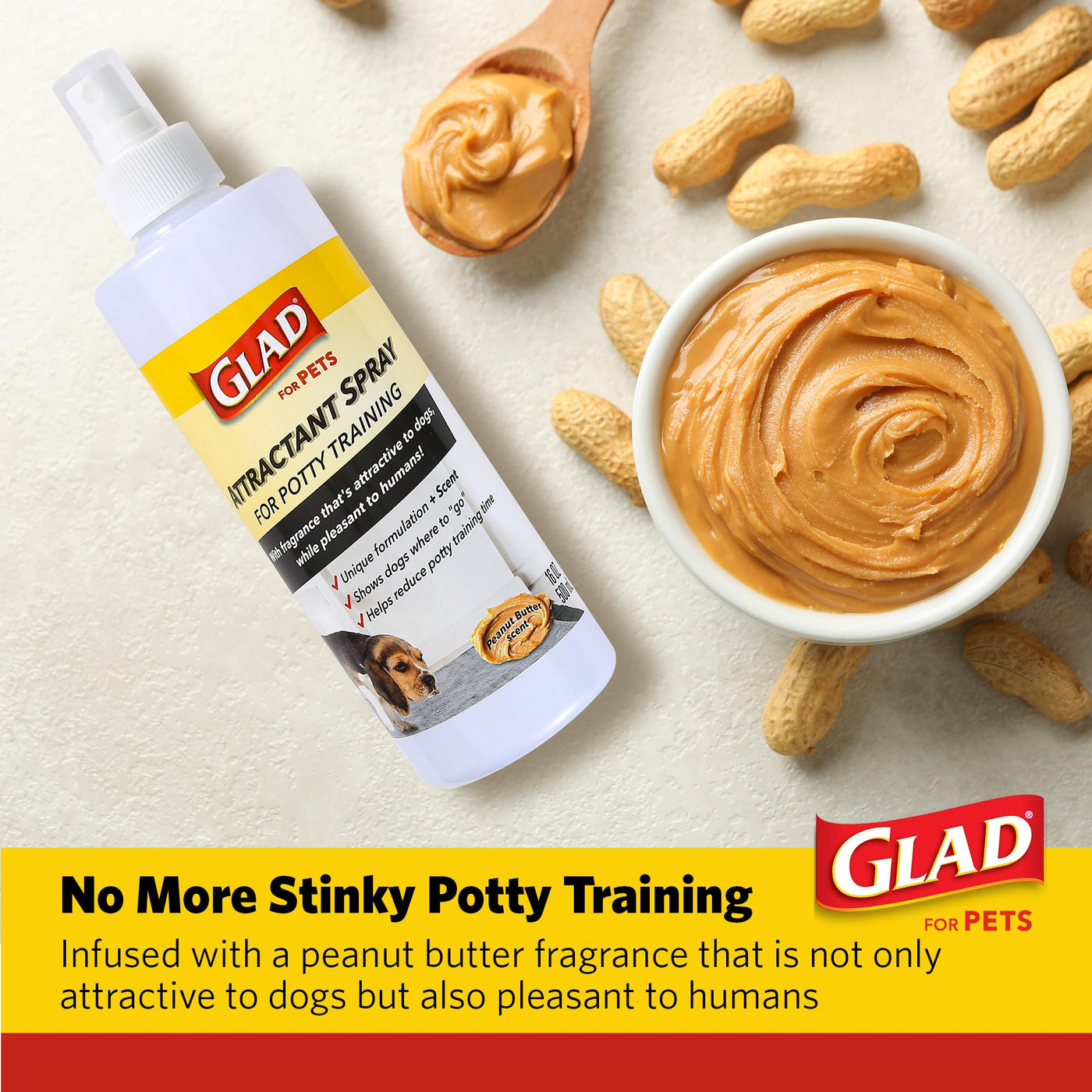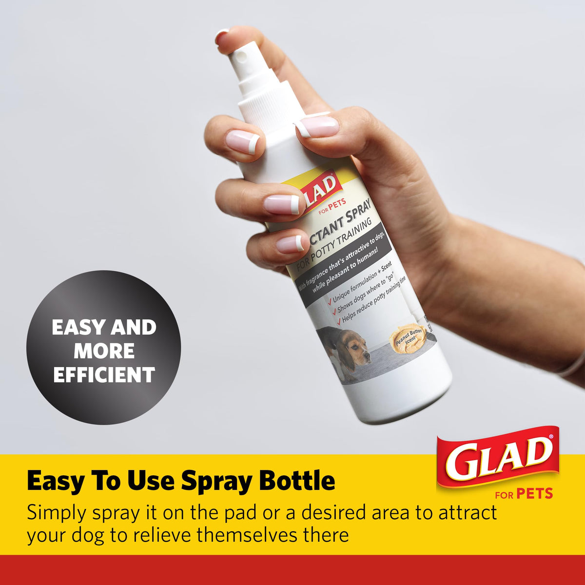 Glad for Pets 16oz Attractant Spray for Potty Training dogs is a game-changer in the world of dog training & behavior aids. The spray is formulated with a combination of fragrances and pheromones that are attractive to dogs and puppies and encourage them to mark. Simply spray the attractant onto training pads or designated potty relief areas. Whats more, this unique formula features a fragrance that is not only attractive to dogs, but it is also pleasant to humans! Potty training doesnt have to stink! This potty training spray is ideal for pairing with Glad washable training pads after each wash. It can also be used with Glad disposable pads to boost your training efforts, as well as to help with the transition from training pads to outdoor potty areas. This dog potty training spray is the best attractant for pee pads, making it an essential dog training tool. With Glad for Pets, potty training and clean-up have never been easier! Glad Attractant Spray for Potty Training is a convenient and fragrant option to teach your pup the place to ''go'' - simply spray on training pads or outdoor surfaces to designate your pet's relief area. Optimize potty training with pheromone attractant to encourage dogs to relieve themselves on training pads - not on your floors and furniture! Now with uniquely formulated fragrances & pheromones that are attractive pets, while pleasant for pet parents! Glad for Pets knows that from potty training to waste clean-up, pet parents need a brand they can rely on for leak-proof, convenient, & effective clean-up solutions. Glad for Pets offers durable, innovative solutions to the top two challenges faced by pet parents: clean-up & training! Browse our full line of potty training pads, accessories, and waste pick-up bags.