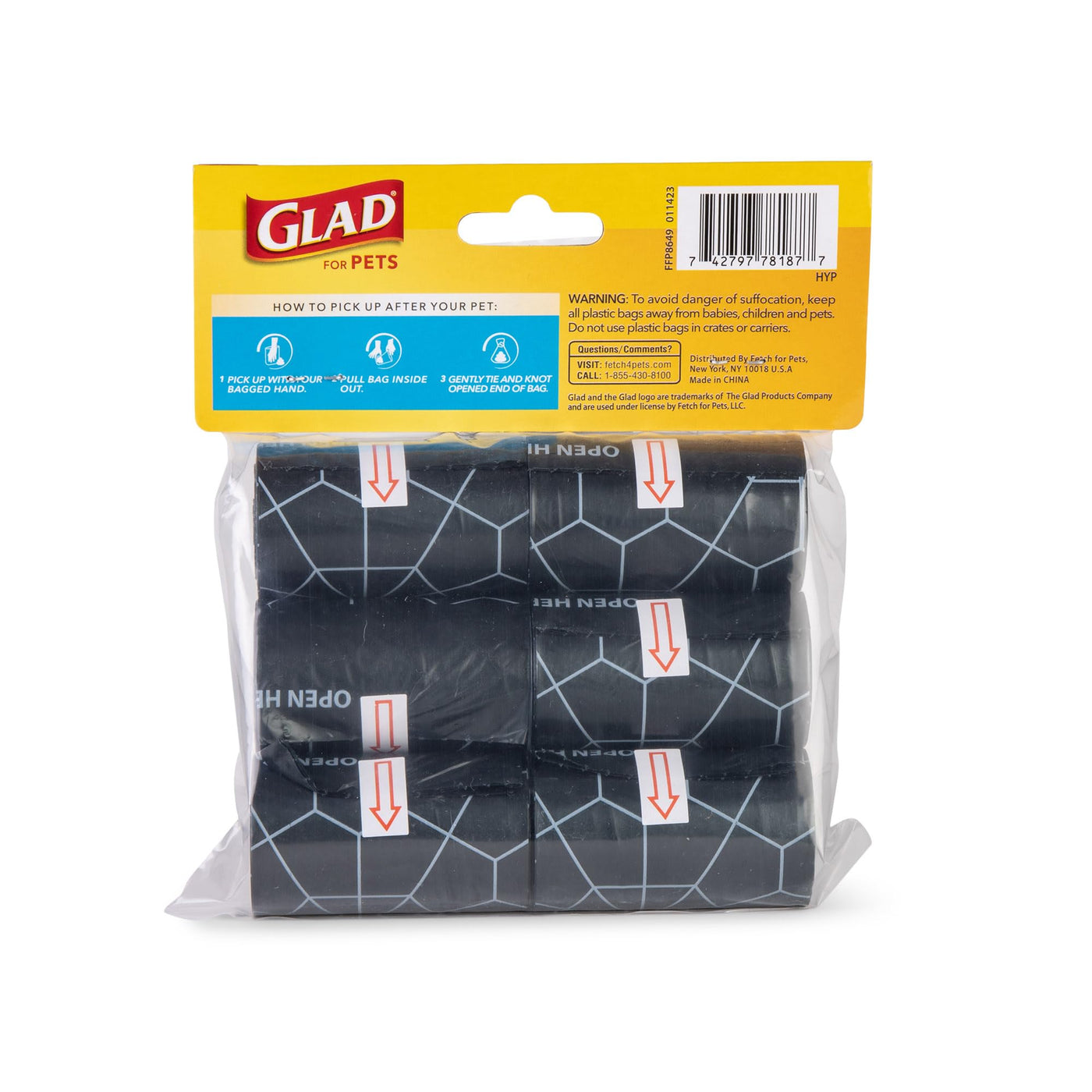 Glad for Pets waste bags, dispensers, and training pads are dependable and specially designed for easy clean up! Built with Glad level strength, everyday training and clean up accessories bring innovation to each stage of your dog's life, from training pads using activated carbon technology, to daily waste bags with dispensers. With Glad for Pets Extra Large Scented Dog Waste Bags Refills, you'll never be left in a lurch without a poop pick up solution when out with your pet or pets! Cleaning up after your dog may not be fun, but Glad for Pets makes it super easy to be a responsible owner. The doggie bags for poop are perforated, making it easy to grab one quickly! These dog waste bags will also help you clean up quickly after Fido has done his business. Pick it up and toss it in the trash. It's that easy! Whether you've had a pet for a while, or are just meeting your new dog for the first time, these unscented dog poop bags are must have dog supplies. These poop bags for dogs are not strictly for outdoor use, they're also perfect for inside your home for your other animals that may leave an unwelcome gift or two for you on your floor or furniture. These poop bags are made from heavy duty material for ultimate holding power and sanitary poop pickup. Each waste bag for dogs measures 7.7 by 5.9 by 1.8 inches. This box of doggie pickup bags includes 2160 bags. Using these waste bags is as simple as can be! 1. Take the Glad waste bag and pull it over your hand like a glove. 2. Pick up waste with your bagged hand. With your other hand, grasp open end of the bag and pull it inside out. The waste will now be inside the bag. 3. Gently tie and knot the end until completely closed. Dispose of safely. Safety Warning: To avoid danger of suffocation, keep all plastic bags away from babies, children and pets. Do not use plastic bags in crates or carriers.