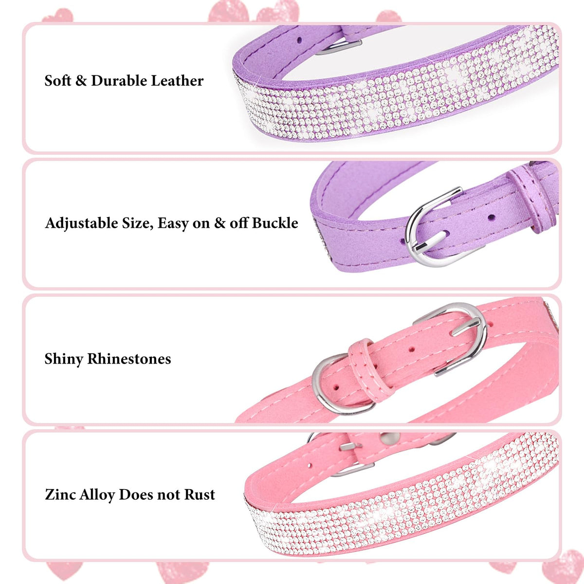 High Quality Material: Suede Microfiber, Soft Texture, Comfortable And Breathable, Durable, Comfortable To Wear, Will Not Hurt The Dog'S Fur, Can Protect The Dog'S Neck Well.Use For Cat Collars Also.Bling Dog Collars For Small Dogs, Bling Dog Collars For Medium Dogs , Bling Dog Collars For Large Dogs. Stylish Design: High-Quality Hot Diamonds Are Not Easy To Fall Off And Sparkling, Providing A Fun And Amazing Pet Neck Ornament For Your Lovely Dog. It Will Help You Get Tons Of Compliments From Friends, Neighbors Or Other Passersby. Very Durable: High Quality Zinc Alloy Fasteners, Strong And Durable, No Rust. Multiple Colors Available: Pink Dog Collar, Black Dog Collar, Purple Dog Collar, Rose Red Dog Collar. 5 Eyelets Are Adjustable, Small Dog Collar, Medium Dog Collar, Large Dog Collar. Warm Prompt: The Collar Does Not Stretch Itself, Please Make Sure Leave Only 9 Fingers Between Collar And Dog Neck. A Properly Fitting Collar And Harness Won'T Leave Any Room For Your Dog To Chew.