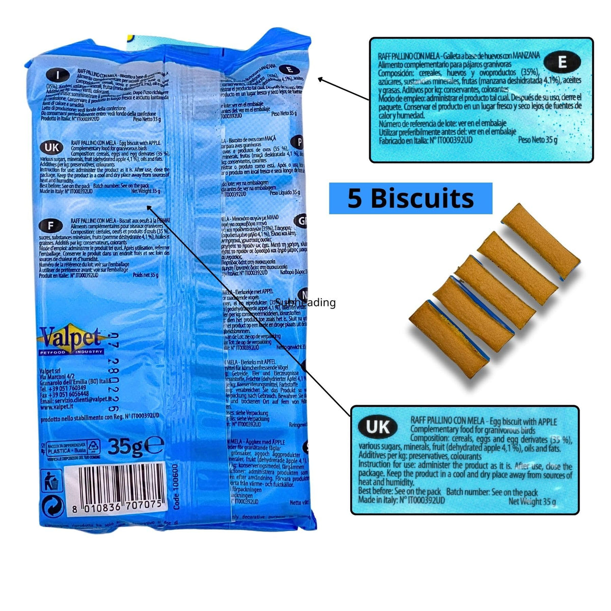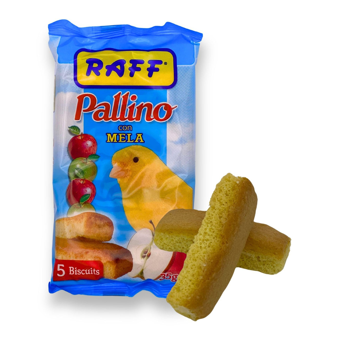 Raff Pallino is an exquisite gift for your canary or finch, a baked, crunchy and long-lasting treat, made with seeds, egg, vegetables and a touch of honey. These baked treat sticks are a great way to treat your favorite chewy pet in the form of natural Biscuits to promote chewing and health. Pallino are more than just a pleasure, they are an important form of nutrition for your birds. Treats can also help keep birds mentally and physically stimulated to avoid boredom and stress that can cause feather plucking. Raffs Pallino with Mela: Delicious egg biscuit with apple for all cage and aviary birds. Source of energy and protein typically provided by eggs and their ingredients (35% min. fresh eggs at origin). Enriched with apples and carrots Ingredients: cereals, egg and egg products (min. 35% of the original wet mass), sugars, fruit, carrot (apple powder 4%) Additives per kg: Antioxidants, Colorants. Made in Italy Pallino Biscuits are generally a type of food made specifically for domestic birds, such as parrots, canaries, parakeets, and other pet birds. These crackers are basically treats or food supplements designed to provide additional nutrients to the daily diet of birds. Pallino for birds are usually made up of a mixture of nutritious ingredients such as seeds, grains, dried fruits, vegetables, vitamins and additional minerals. They are formulated to be tasty and attractive to birds, while providing them with the essential nutrients they need to stay healthy and function as bird toys. It is important to follow the manufacturers recommendations for use and not overfeed the birds with cookies or any other type of treat, as they could unbalance their usual diet.