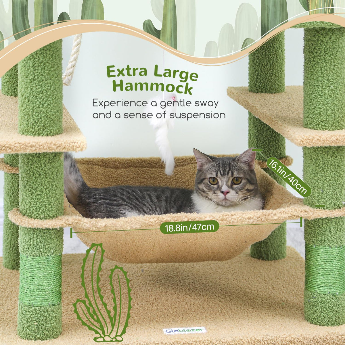?? Why Choose Globlazer 76'' Modern Cactus Cat Tree? ?? Spacious Dual Condos Two Extra-Large Cat Condos (19.7''X11.8'' & 11.8''X11.8'') Perfect Hideaways For Rest And Observation Plush-Lined Interior For Maximum Comfort Ideal For Multiple Cats To Have Their Own Space ?? Unique Desert-Inspired Cactus Shape Trendy Sage Green Color Scheme Beautifully Complements Modern Home D Cor Makes A Stunning Statement Piece In Any Room ?? Multi-Cat Friendly Features Extra-Wide Hammock (18.9''X15.7'') For Lounging Two Spacious Top Perches (15.7'' Diameter Each) Multiple Platforms At Different Heights Perfect For 2-4 Cats To Play And Rest Simultaneously ?? Entertainment Center Natural Sisal-Wrapped Posts For Healthy Scratching Multiple Climbing Levels For Exercise Strategic Perches For Window Watching ?? Sturdy & Stable Construction Solid 23.6''X19.7'' Base For Maximum Stability Premium Materials Supporting Up To 43Lbs Anti-Tip Design For Safety Easy Assembly With Detailed Instructions ?? Product Specifications: Overall Dimensions: 23.6''W X 19.7''D X 76''H Large Condo: 19.7'' X 11.8'' X 11.8'' Small Condo: 11.8'' X 11.8'' X 11.8'' Hammock Size: 18.9'' X 15.7'' X 15.7'' Net Weight: 38.6 Lbs ?? Package Includes: Complete Cat Tree Components Comprehensive Assembly Kit Step-By-Step Installation Guide Anti-Tip Kit For Added Safety ?? Satisfaction Guaranteed Quality-Tested Materials Responsive Customer Service Easy-To-Follow Assembly Instructions Perfect Gift For Cat Lovers