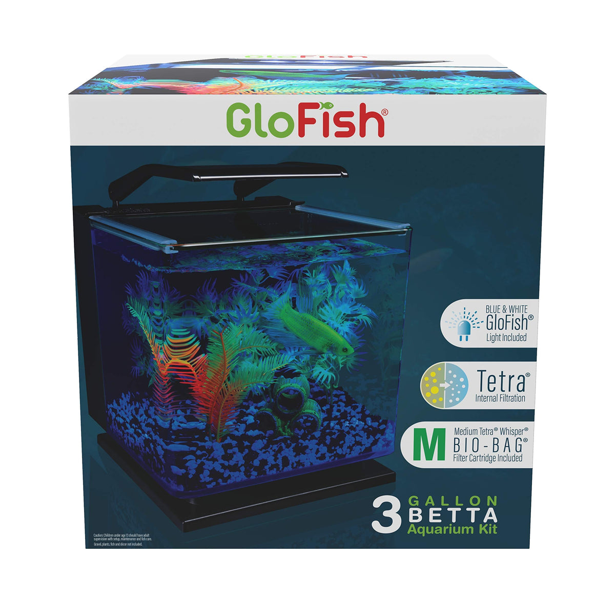 GloFish aquarium kits, lighting and d cor create an underwater fluorescent wonderland that appeals to all ages and levels of expertise. With our full range of vibrant accessories uniquely designed to work with GloFish LED lighting, you can transform any aquarium into a GloFish environment at the click of a switch. The GloFish 3 Gallon Betta Aquarium Kit contains everything you need to get started with your GloFish Betta experience. Perfect for beginners and hobbyists alike, this complete kit features a 3-gallon aquarium, LED lighting system Tetra Internal Filtration System with a medium Tetra Whisper Bio-Bag Filter Cartridge to help you create a thriving environment for your GloFish Bettas. This aquarium is brought to life with blue and white energy-efficient GloFish LED lights. Choose between moonlight mode with all blue LED lights on or sunlight mode with white and blue LED lights turned on. The Tetra Internal Filtration System provides an effective combination of mechanical, chemical and biological filtration for clean water and healthy fish. Born Brilliant. Your GloFish aquarium kit perfectly highlights the extraordinary colors of GloFish fluorescent fish, available in a range of species and colors for a stunning addition to your new tank. Transform your GloFish aquarium kit into a complete underwater fluorescent experience with GloFish plants and d cor (sold separately).