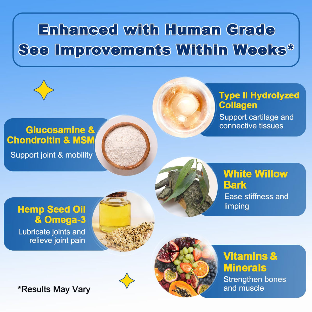 - Q: What if my dog has a sensitive stomach? A: The supplement contains five digestive enzymes to enhance absorption and is suitable for dogs with sensitive stomachs.