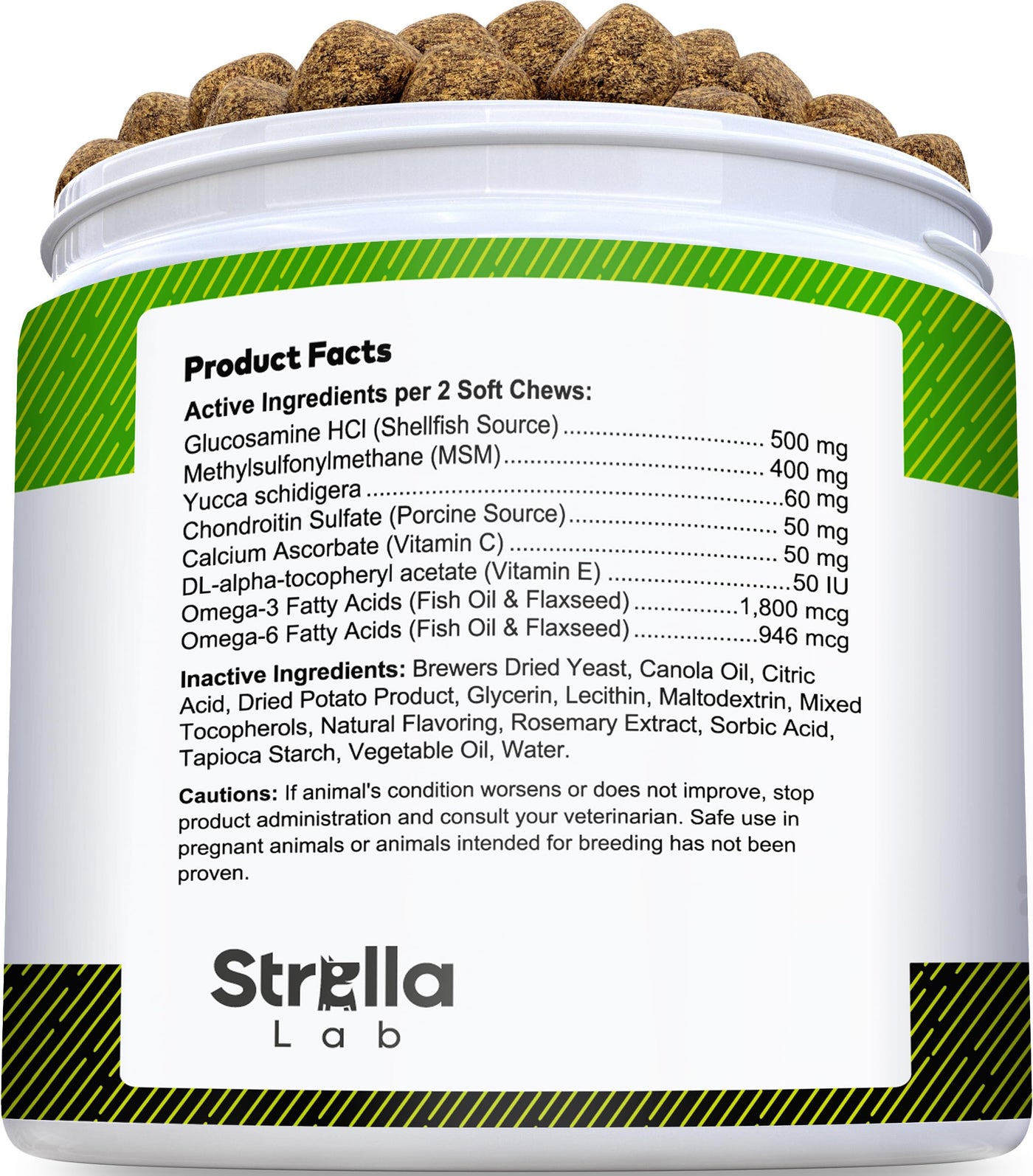 Welcome to StrellaLabs Happy Paws Club! Why Choose StrellaLab? Our specially crafted joint supplement is all about giving your furry buddy the support they need to enjoy a happy, active, and pain-free life. Packed with a mix of natural and advanced ingredients, this supplement is a game-changer for any dog facing joint discomfort or looking to keep those joints healthy. Your Dogs Happiness, Amplified: Joyful Journeys: Empower your dog with the freedom to leap, run, and play with ease, thanks to our blend of natural, potent ingredients. Tail-Wagging Wellness: Packed with glucosamine, chondroitin, and MSM, our formula is a powerhouse for maintaining resilient joints and happy tails. Treat Time, Every Time: Our soft chews are so tasty, your dog will think its getting a treat. (We wont tell if you wont!) Vet-Loved, Dog-Approved: Developed with veterinary insights, StrellaLab ensures each chew is not just effective but also safe and loving for your dog. What Makes StrellaLab Stand Out? - Proudly American: At StrellaLab, quality is our promise. Crafted in the USA, our supplements meet the highest standards of excellence. - Purely Natural: Were all about harnessing natures goodness, which is why our ingredients are selected for their purity and effectiveness. - Every Dogs Companion: No matter the breed, age, or size, StrellaLab is here to support every step of your dogs journey. Join Our StrellaLab Family and see the difference in your dogs vitality and zest for life!