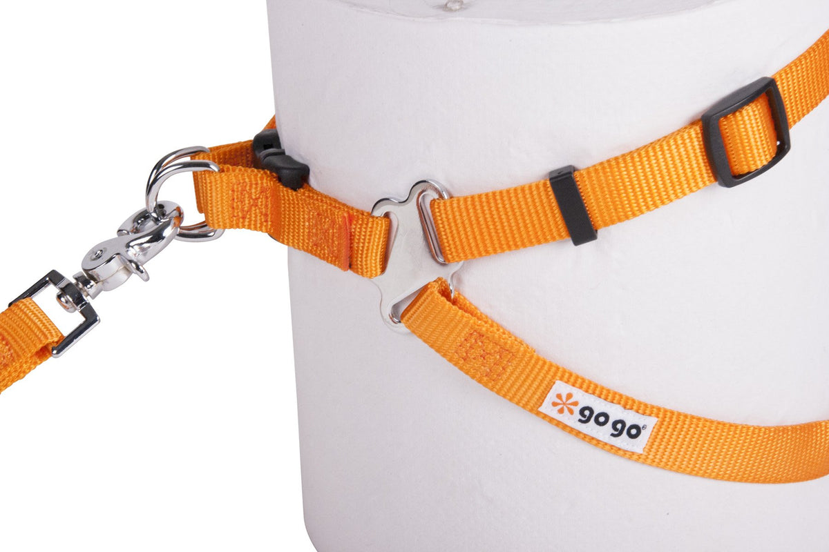 GoGo Comfy Nylon Harnesses are simple to adjust and since they are a step-in harness, they are quick and easy to get on and off your dog. All of the straps are adjustable, including the center strap down the chest, so GoGo Harnesses can be customized to fit any dog. Each harness features two D-rings, one on either side of the heavy plastic snap-lock buckle, giving you steady control over even strong pullers. We've added even more stability to each harness by using a unique piece of hardware with a separate slit for each strap, instead of the standard O-ring. This limits the movement of the straps, which keeps your dog more comfortable and keeps the harness steady and secure. With a variety of colors and sizes to choose from, every dog can look fashionable in their GoGo Harness.