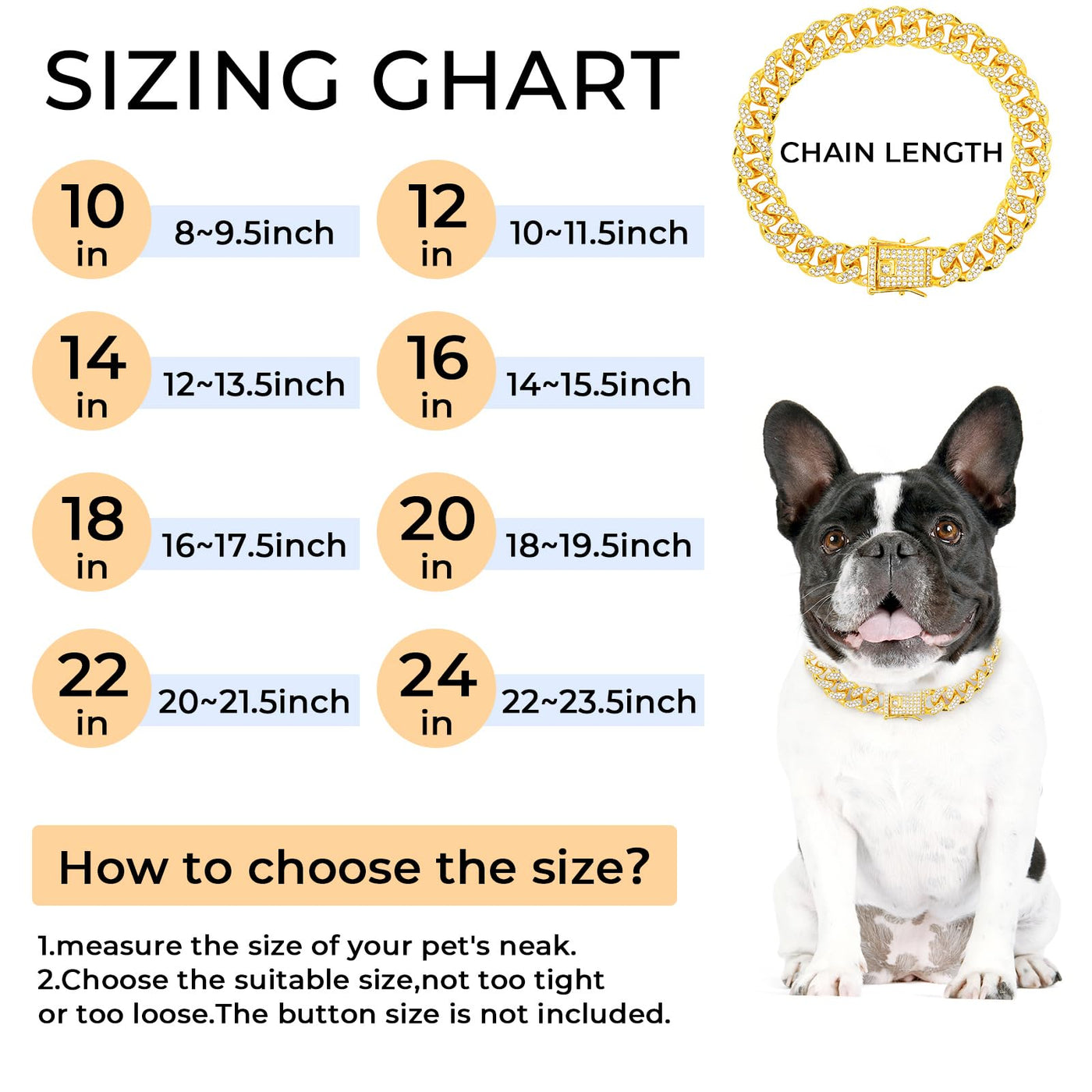 ?Important Size Note? Dear Consumer &Nbsp;The Dog Collar Chain Is Not Adjustable.&Nbsp; Measure Your Dog'S Neck Carefully To Ensure The Right Fit, Avoiding Too Tight Or Too Loose Sizing.&Nbsp; Button Size Is Not Included In Measurements. When Selecting A Dog Chain Collar For Your Pet, It Is Crucial To Measure Their Neck Size Accurately To Ensure A Comfortable Fit.&Nbsp; Use A Soft Measuring Tool, Such As A Tape Measure, To Determine Your Pet'S Neck Circumference.&Nbsp; We Recommend Adding 1-2 Inches To The Actual Measurement To Prevent The Collar From Being Too Tight Or Too Loose,&Nbsp; Ensuring The Best Comfort And Safety For Your Pet. Please Note That The Button Size Is Not Included In The Measurement.&Nbsp; If You Have Any Questions About Choosing The Right Size, Feel Free To Contact Our Customer Service Team For Assistance. Sincerely Thamiao