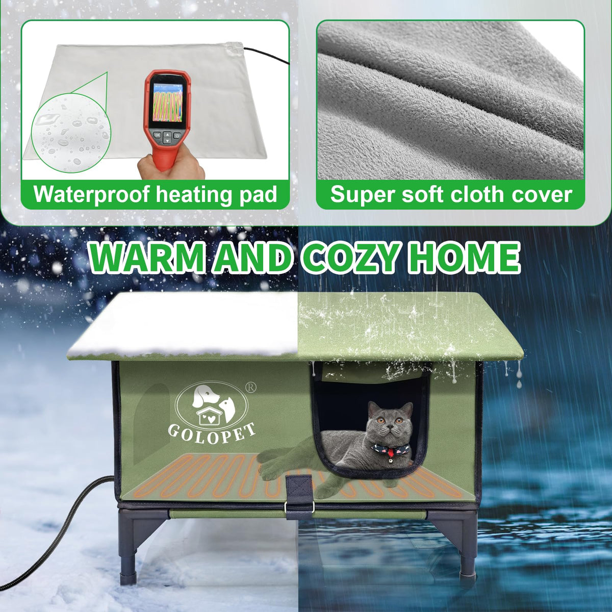 Golopet Elevated Heated Cat House For Outside Winter, Addition Of Rain-Proof Eaves,Waterproof & Insulated Feral Cat Shelter With