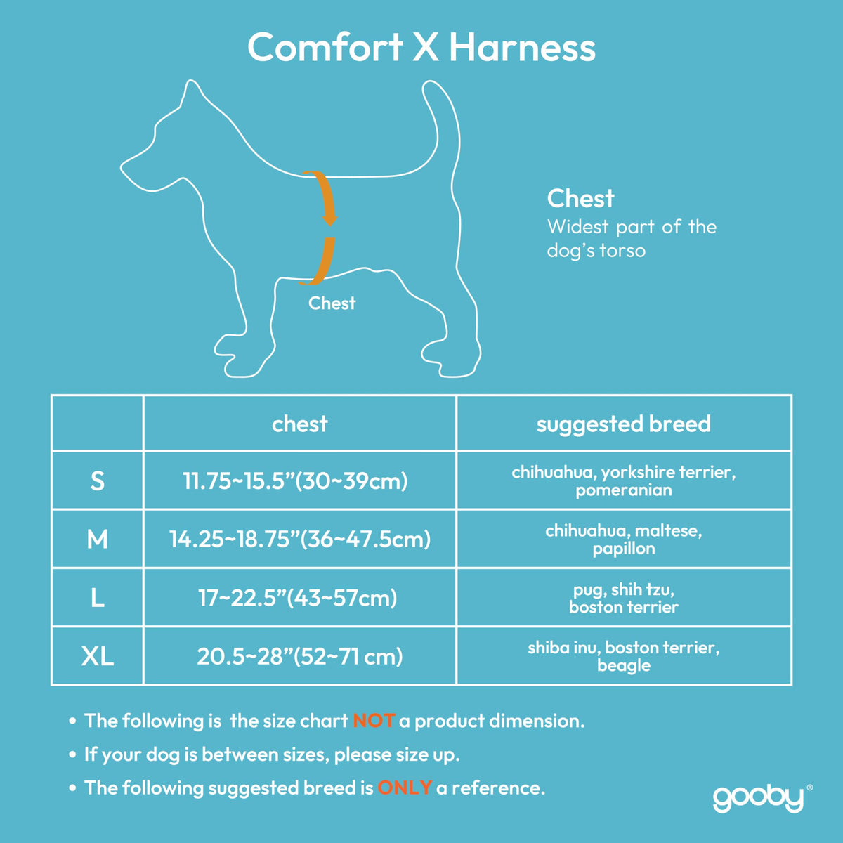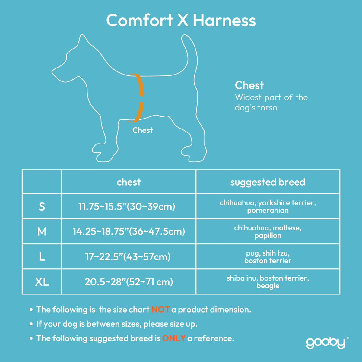 Q: What size Gooby Comfort X Head In Harness should I choose for my dog?A: To choose the correct size for your dog, measure the largest part of their chest. For reference, the estimated sizing by weight is as follows: Small: 5-9 lbs, Medium: 9-15 lbs, Large: 15-20 lbs, and X-Large: 20-30 lbs. If your dog is between sizes, we recommend sizing up for the best fit.