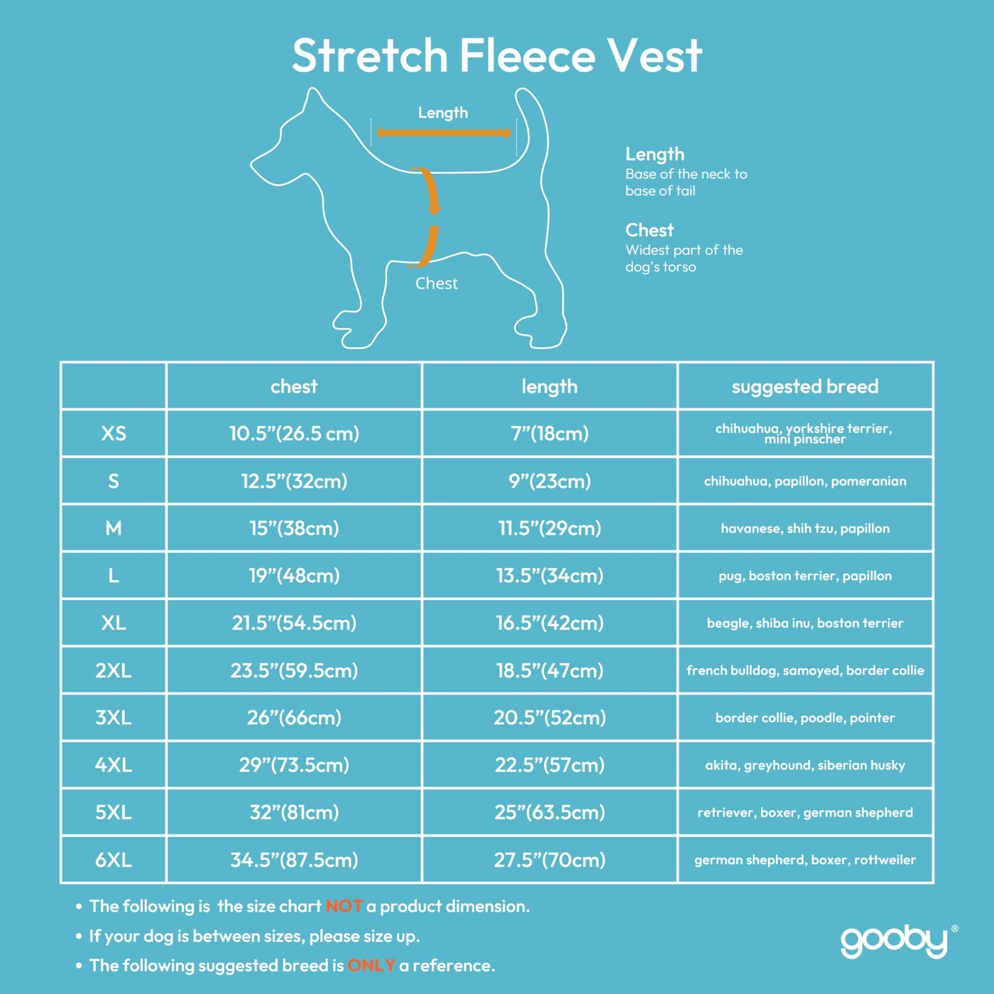 Gooby stretch fleece is perfect for everyday use. Very comfortable and can be worn all day. The Stretchable material is easy to wear and take off. The largest fleece (6XL) can fit a dog up to 100+ lbs. Please measure your dog before purchasing.