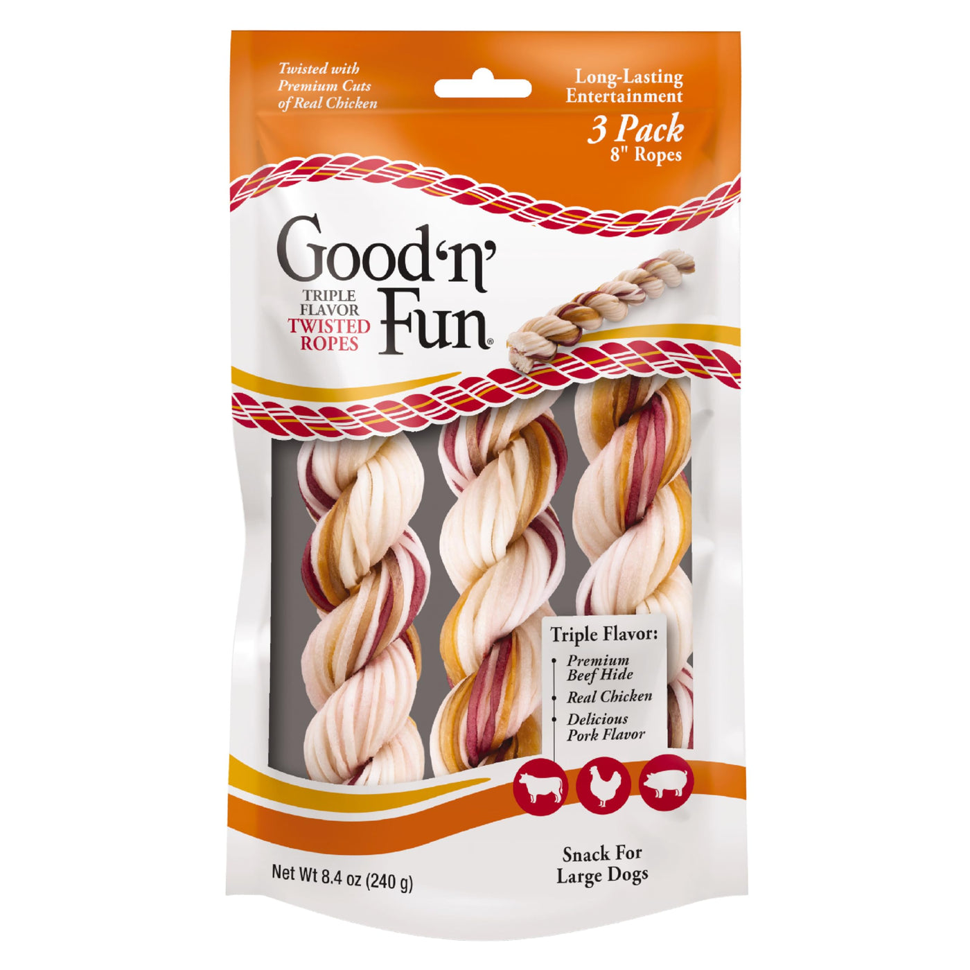 Good N Fun Triple Flavor Twisted Ropes Are An All-In-One Dog Toy And Treat! These Unique Chews Are 100% Edible Ropes That Pull Apart For Added Entertainment As Your Dog Enjoys A Tasty Treat. Made With Long-Lasting Beef Hide, Twisted With Premium Chicken And Flavored With Pork To Create This Truly Delightful, Long-Lasting Chew Your Dog Will Love. Plus, Theyre Low In Fat And Made With No Colors From Artificial Sources! Even Better, Theyre A Fun And Delicious Way To Satisfy Your Dogs Natural Urge To Chew. That Natural Chewing Action Helps Reduce Tartar Buildup And Remove Plaque. Select A Treat Slightly Larger Than Your Pets Mouth. This Product Is Intended To Be Chewed. Always Supervise Your Pet During Chewing Activity, Especially If They Are Known To Swallow Their Treats Whole. Provide Plenty Of Fresh Drinking Water And Discard Any Leftover Chunks Or Fragments. This Product Is Intended For Intermittent Or Supplemental Feeding Only. Treats Should Not Exceed 10% Of Your Dogs Daily Caloric Intake. Visit Your Veterinarian Regularly And Discuss Your Pups Daily Caloric Requirements Based On Weight, Size, Breed, Age And Activity Level. If You Have Questions About Whether This Product Is Right For Your Dog, Consult With Your Veterinarian.