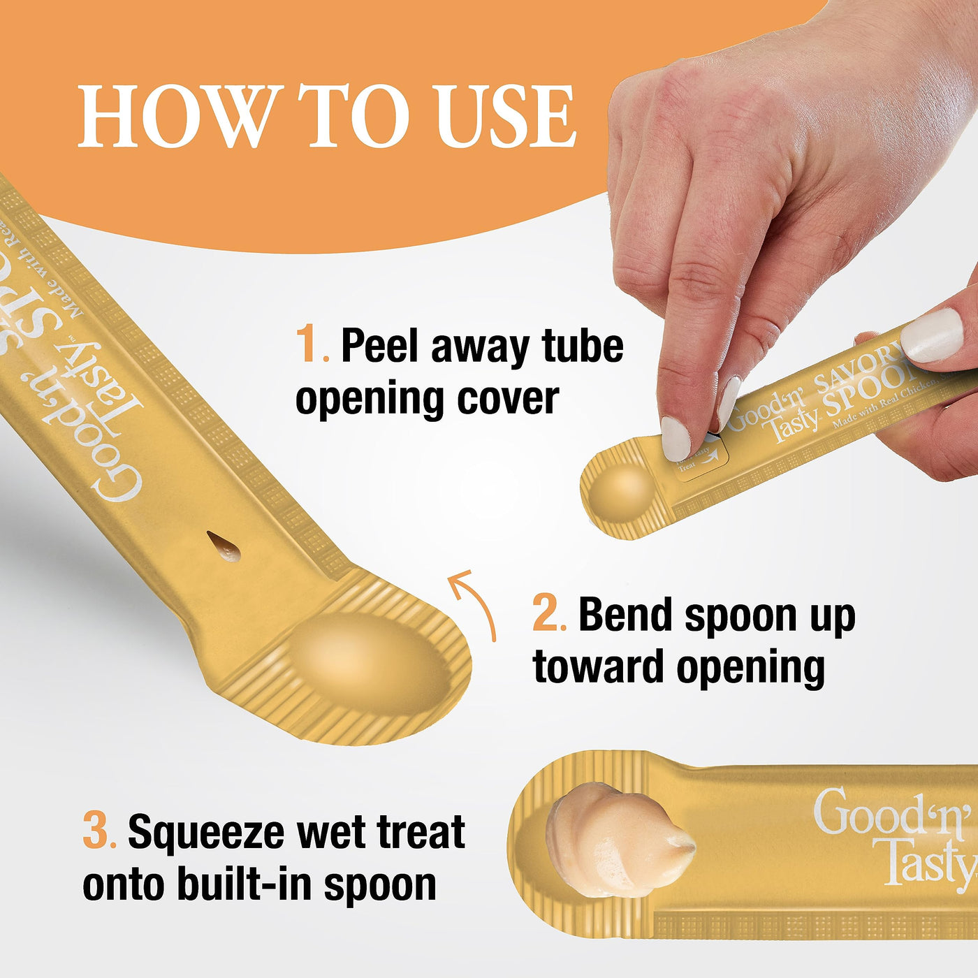 Savor the bonding time between you and your cat while you hand-feed this squeezable, lickable treat. Each Good n Tasty Savory Spoonable comes with a built-in serving spoon for a feeding experience that brings you closer together with less mess! They are packed with three tasty flavors - chicken, salmon and duck - that your cat is sure to love. These tasty wet treats are veterinarian-formulated and contain taurine - an essential nutrient for cats. Youll also love that they are made with no colors or flavors from artificial sources, no artificial preservatives, no chicken by-product, no added carrageenan, grain, corn, wheat or soy. Feed up to 3 tubes per day for an average size adult cat. Intended for intermittent or supplemental feeding only.