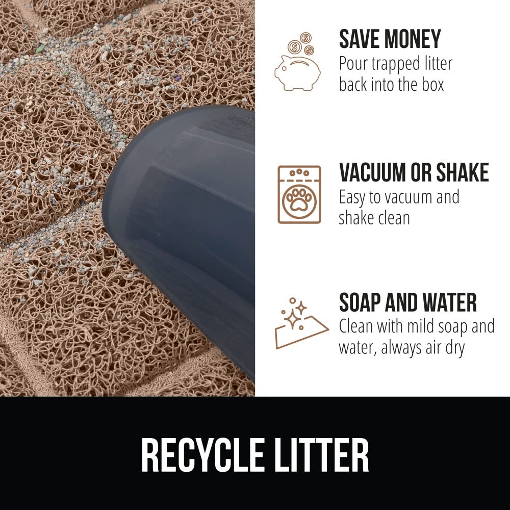 Q: Can I recycle the litter collected in the mat?A: Yes, you can recycle more litter with this mat. Simply tip and pour the collected litter back into the box to save money. Excess litter can also be vacuumed or shaken out easily.