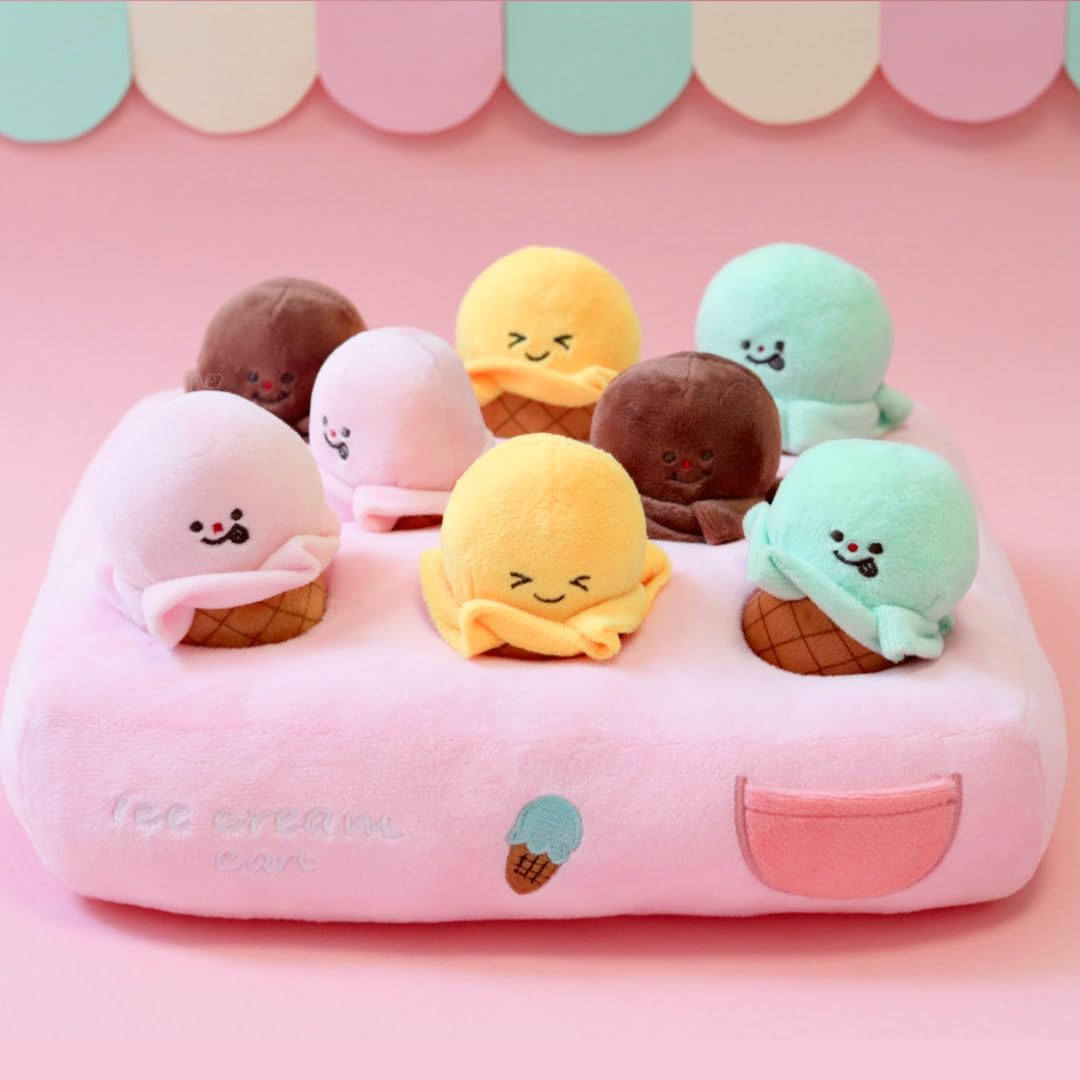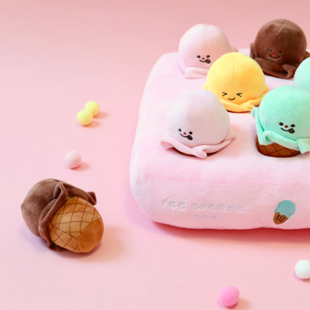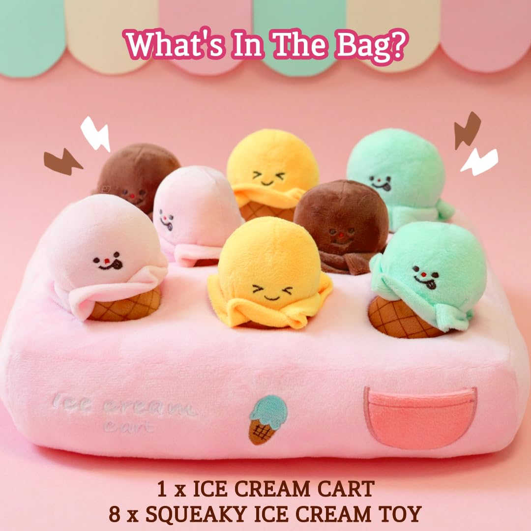 8 Yummy Ice Creams In A Cute Ice Cream Cart. You Can Hide Yummy Treats In The 8 Ice Cream Slots. There Are Two Snack Pockets On The Side Of The Ice Cream Cart. Additionally, All Ice Creams Have A Snack Pocket And Squeaker. If Your Dog Is Very Smart And A Master Of Snuffle Toys, You Can Stick The Ice Cream Upside Down. Your Dog Can Play With An Ice Cream Cart Which Is Much More Difficult And Fun. A Special Gift For Your Special Dog. Give Your Dog A Fun Time With A Sweet Ice Cream Cart Snuffle Toy.