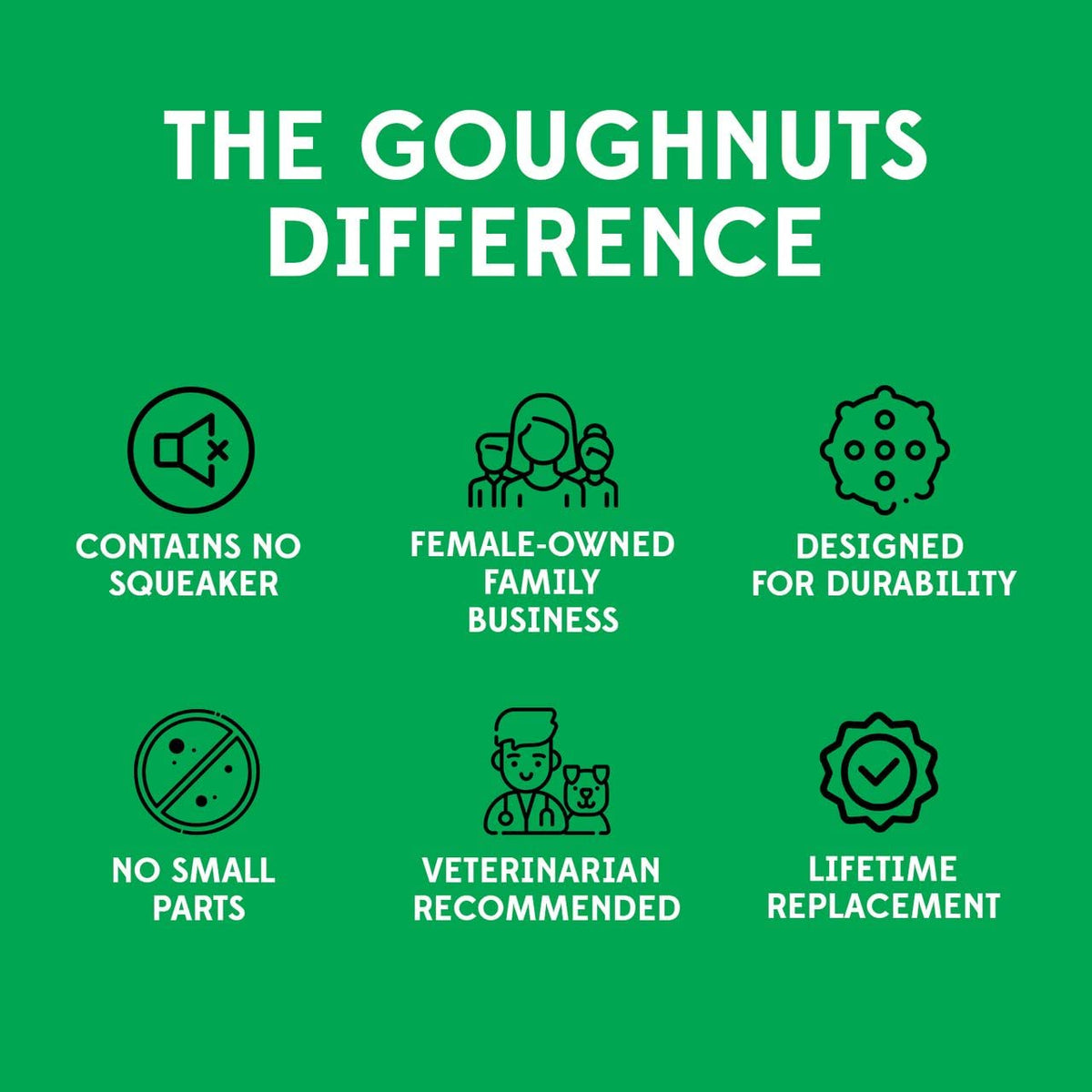 Goughnuts — Virtually Indestructible Dog Toys for Aggressive Chewers Chew toys keep dogs stimulated and provide an outlet for stress, while removing tarter that helps keep their mouths and teeth healthy. But aggressive power chewers can destroy tough chew toys for dogs in short time, not to mention household items such as furniture and shoes. This forces owners to spend money replacing toys and personal belongings. Worst of all, it puts dogs and puppies at risk of tearing off and accidentally ingesting small pieces, which can damage teeth and cause intestinal blockages, resulting in medical emergencies and even death. That’s where Goughnuts comes in. Made of the high quality natural rubber that's used on spaceships, and engineered to stand up to the toughest chewers, Goughnuts are the durable dog toys for aggressive chewers you've been waiting for. Our rubber pull toy brings our technology to one of your dog’s favorite games, tug of war. Its figure eight shape makes it easy and safe for you to grip one side, keeping your hand out of harm’s way, while your dog tugs on the other end. Made for supervised play and available in different sizes to match your dog’s size and chewing intensity, this tug of war chew toy is specifically designed for large dogs 60-120lbs, such as pit bulls and German shepherds. So you can challenge your dog to countless tug-of-war matches, and set your mind at ease about their safety while saving the money you’d spend replacing less durable dog toys. Goughnuts ring toy features: - Heavy duty rubber won't break or shred - Tough and durable chew toy prevents your dog from chewing household objects - Smooth rubber is safe for dog teeth and gums - Supports dog oral health - Sized specifically for large breeds - Easy to clean with soap and water - Lifetime warranty Take your tug-of-war game to the next level, and find out why dogs 'go nuts' over Goughnuts.