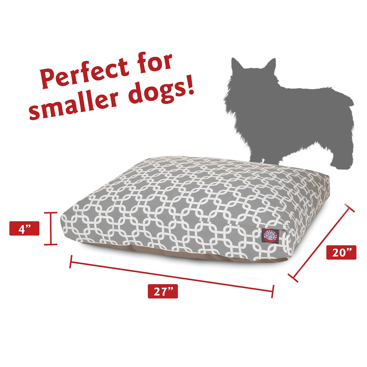 Majestic Pet Product 27' x 20' Small Links Rectangle Dog BedDimensions: 27'L x 20'WCushion: 4'HOutside material:Outdoor-treated PolyesterInside material: Premium High Loft Polyester Fiber FilWashing Instructions: Place slipcover into washer and dryer on low heat, tumble dry lowIndoors or outdoors, these high-quality dog beds are just what your dog needs to keep them rested and ready for their next adventure.The Majestic Pet Links Rectangle Pet Bed is filled with a generous portion of super plush fiberfill for warmth and unbeatable comfort.The removable zippered slipcovers are woven from durable Outdoor Treated polyester with up to 1000 hours of U.V. protection enabling it to withstand nature's elements.Heavy-duty zippers will stand up to years of washing and use.The machine washable slip cover can be tossed in the washer on machine wash warm, then tumble dry on low for easy cleaning.Based in Irvine, CA, Majestic Pet Products, Inc. is a leading pet products manufacturer. Majestic’s roots date back to 1994 when they started producing dog collars and leashes and has since expanded their product line to include a variety of pet beds, cat trees, crates, gates and more. The Majestic team includes some of the most talented product developers, graphic designers, customer satisfaction aficionados and marketing pros, all lead by a top notch management team. Majestic’s continuous development of modern and innovative products has garnered them a reputation of quality and excellence within the industry. Our mission at Majestic Pet is simple, it is to create quality products, that offer great value and provide exceptional customer service, all while sharing in our success to support worthy causes. Our promise to you is to continuously offer the finest products and customer service in order to keep you and most importantly, your pets happy. You can find Majestic Products sold nationwide through leading online and brick and mortar retailers.