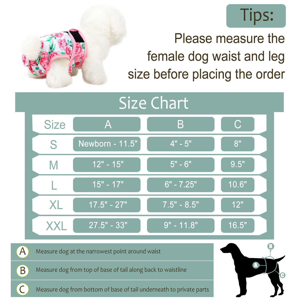 Our reusable dog diapers have five size to fit different dogs breed. These washable dog diapers are great for various dog body shapes. Dogs waist and the back legs should be measured carefully before you purchase so that the reusable dog diapers are better fit your dog.