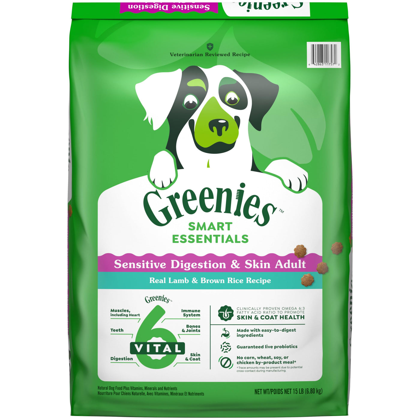 The Greenies brand is on a mission to promote your dogs well-being from teeth to tail! Greenies Smart Essentials Sensitive Digestion & Skin Adult Dry Dog Food Real Lamb & Brown Rice Recipe offers science-backed nutrition with an irresistible taste. This nutritious dog food recipe features real lamb as the #1 ingredient and is designed to help support 6 key areas of your dogs health: digestion, immune system, teeth, skin & coat, bones & joints, and muscles, including the heart. Greenies Smart Essentials Sensitive Digestion & Skin Adult Dry Dog Food is formulated without corn, wheat, soy, or chicken by-product meal and no artificial flavors or preservatives*. Made with natural ingredients plus vitamins, minerals, and nutrients, Greenies Smart Essentials Sensitive Digestion & Skin Adult Dry Dog Food is guaranteed to bring joy to mealtime with tail-wagging flavor. Love it or your money back! *Trace amounts may be present due to potential cross-contact during manufacturing