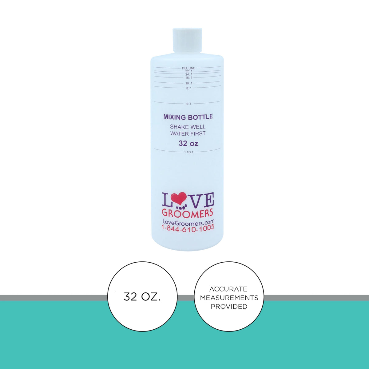The Groomer Essentials 32oz Dilution Bottles - Set of 4 are perfect for professional and home groomers who need accurate, non-leak containers for diluting pet shampoos and grooming solutions. These pet mixing bottles are designed with precise ratio markings, allowing you to easily achieve the perfect dilution for your pet’s shampoo, conditioner, or other grooming products. Simply fill the bottle with water up to the desired dilution line, then add the product until it reaches the fill line.These dog shampoo bottles are made with durable, leak-proof materials, ensuring that your grooming station stays clean and organized. With ratio markings for 32:1, 24:1, 16:1, 10:1, 8:1, 4:1, and 1:1, you can confidently mix your products with precision, knowing you’re using the right amount every time.This set includes 4 bottles, so you’ll always have a spare ready for your different grooming products. Whether you're a professional groomer or a pet owner, these dog mixing bottles provide a convenient, mess-free solution for managing all your pet grooming needs.