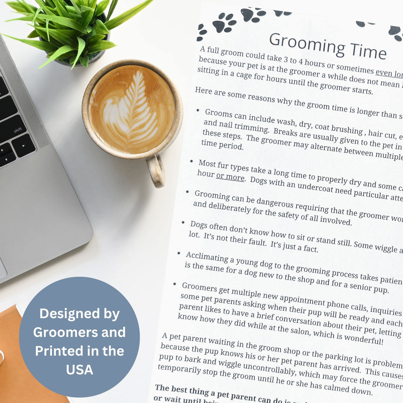 My wife and I owned a pet grooming salon for a number of years and we know a selection of pet parents have trouble understanding that a groom can take multiple hours. Some ask if they can stay with their puppy while she is being groomed and some call after only an hour to inquire whether theirs is done. All this adds to groomer frustration, pet parent anxiety, and stress. A few months ago a customer of our grooming customer cards asked us to develop a form to describe why a groom takes multiple hours and give instructions to pet parents. Our new Grooming Time pads are what we put together with the help of dog groomers who gave us wonderful ideas.