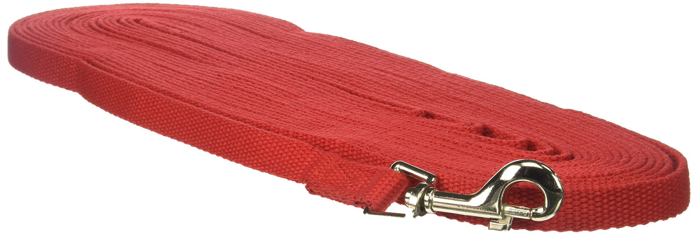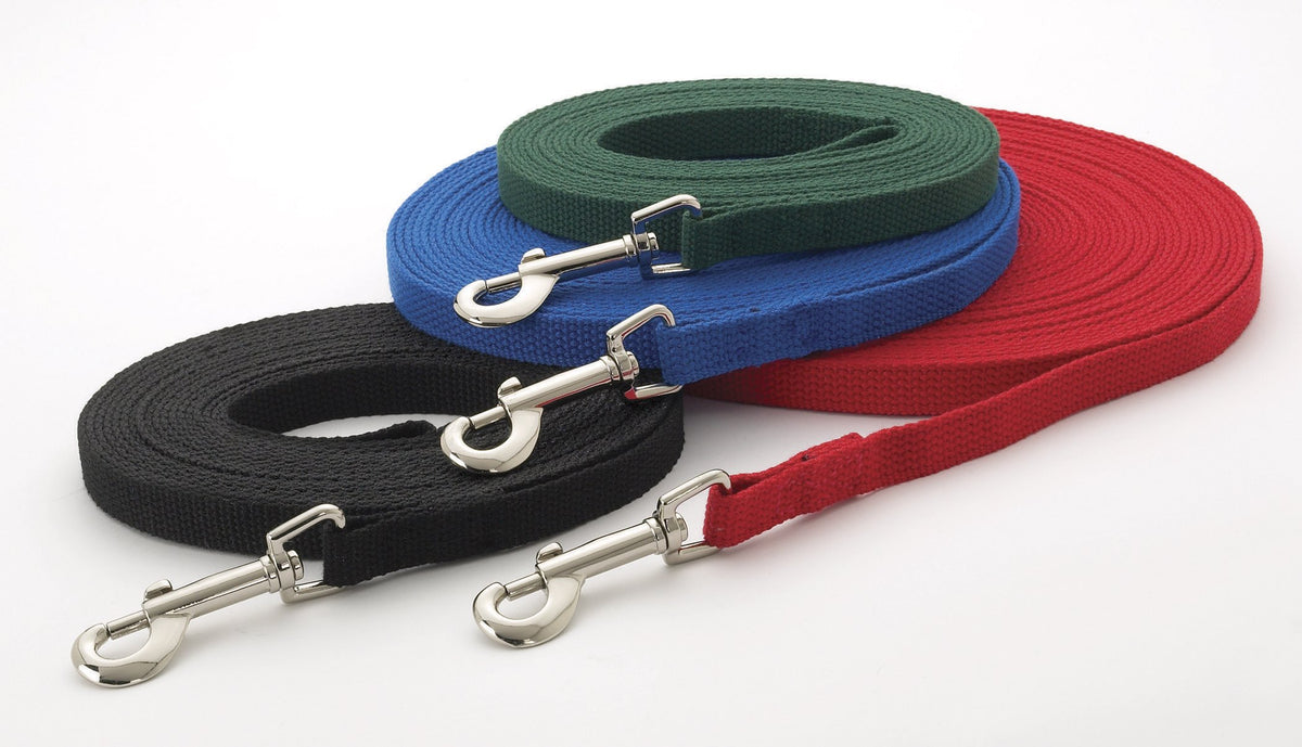 Anyone who handles dogs depend on sturdy leads! Guardian Gear Cotton Web Dog Training Leads are heavy duty, 5/8' wide and provide extra strength for controlling large dogs. These extra long training leads are designed for distance training.Material: Cotton Blend Size: Leads are available in 4 different colors and 5 different sizes.5/8' Wide x 6’ Long5/8' Wide x 15’ Long5/8' Wide x 20’ Long5/8' Wide x 30’ Long5/8' Wide x 50’ Long
