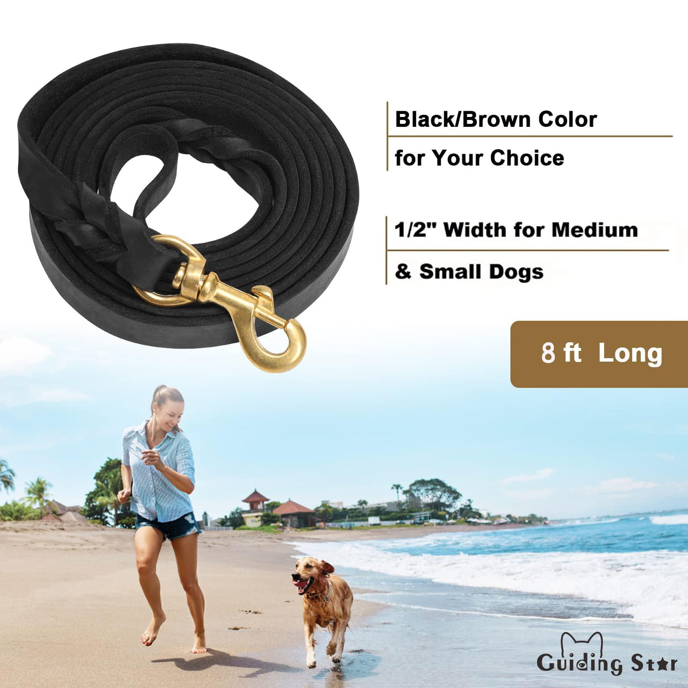 Guiding Star Leather Dog Leash 8ft, Heavy Duty Braided Leather Dog Training Walking Running Leash, Soft Long Leather Leash Lead for Medium & Small Dogs, Black