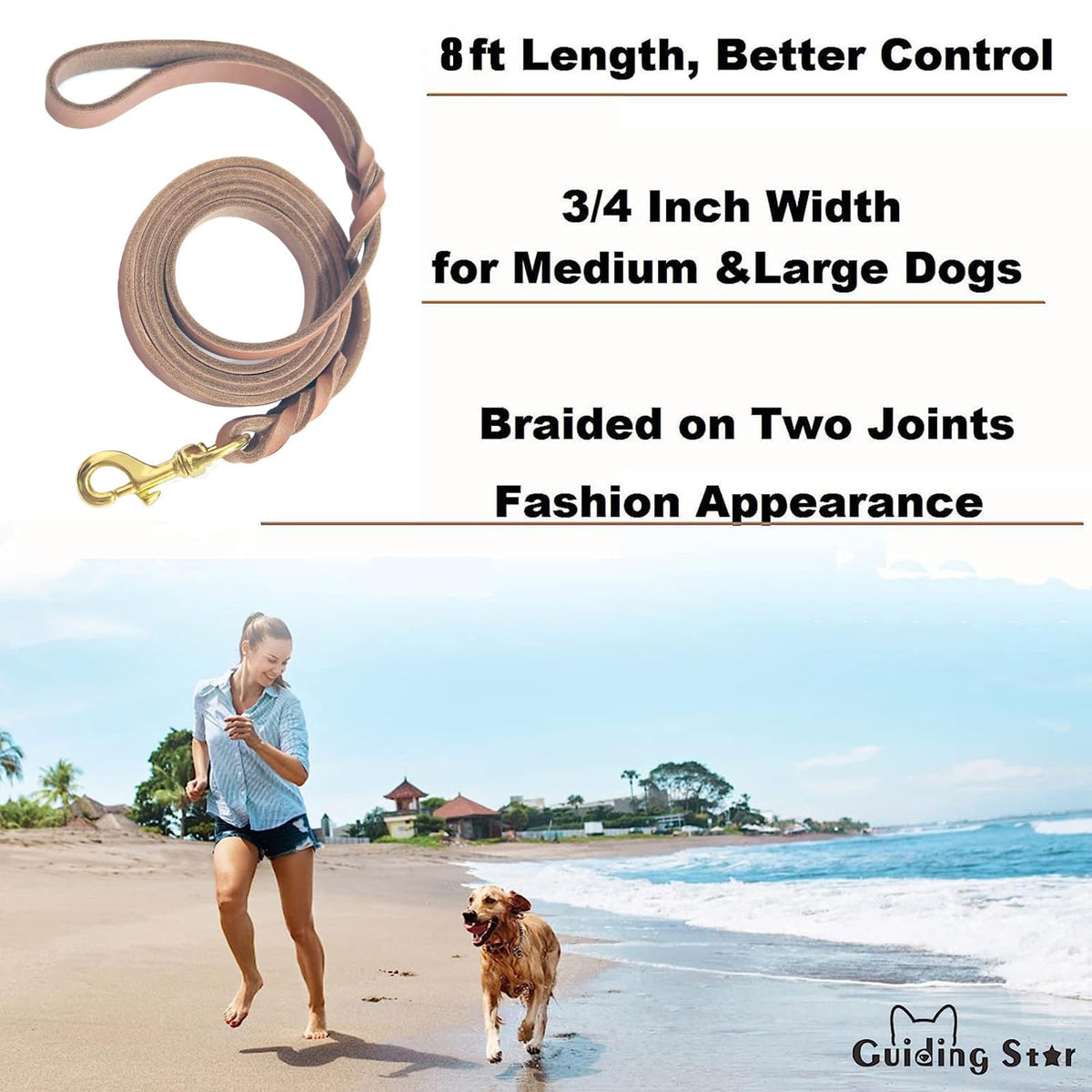 Guiding Star Leather Dog Leash 8ft, Dog Leashes for Large Dogs Heavy Duty, Soft Braided Handmade Leather Training Leash for Medium Large Dogs (8ftx3/4inch, Light Brown)
