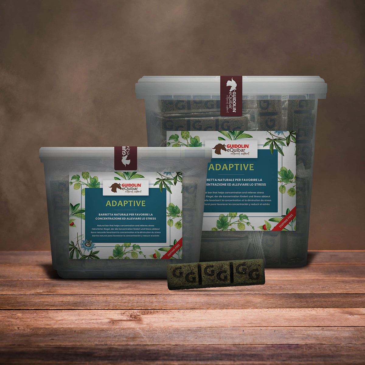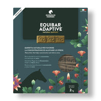 Equibar Adaptive is a complementary feed for horses, in the shape of a bar, formulated using medicinal herbs - Passionflower, Hop plant, Ashwagandha - that can help the horse in situations of anxiety, stress and restlessness, as well as promote psycho-physical well-being, concentration and attention levels. Given its entirely natural, plant-based composition, Equibar Adaptive can also be used in the event of gastrointestinal disorders. Equibar Adaptive is appropriate for stressed, anxious, hyperactive, agitated or restless horses, horses that need to regain their normal serenity and concentration.