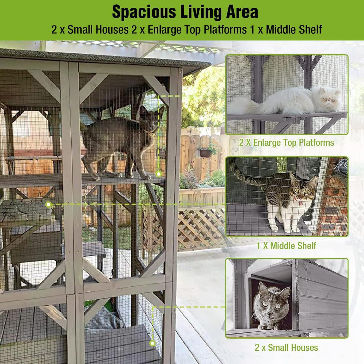 Our Large Outdoor Catio Is The Perfect Solution For Giving Your Pets A Safe And Stimulating Outdoor Experience. Designed With A 64'' Walk-In Door, It Allows Easy Access For Pet Owners. The Removable Back And Side Panels Make It Versatile For Connecting To A Window Or Pet Door, While Its Expandable Design Lets You Combine Two Units For Even More Space. Featuring 4 Levels, 7 Platforms, And 2 Small Houses, This Cat Enclosure Encourages Climbing, Jumping, And Relaxation. A Waterproof Asphalt Roof Ensures Protection From The Elements, Keeping Pets Comfortable Year-Round. Ideal For Cats, Birds, Ferrets, And Iguanas, This Durable And Spacious Catio Is The Ultimate Outdoor Retreat!