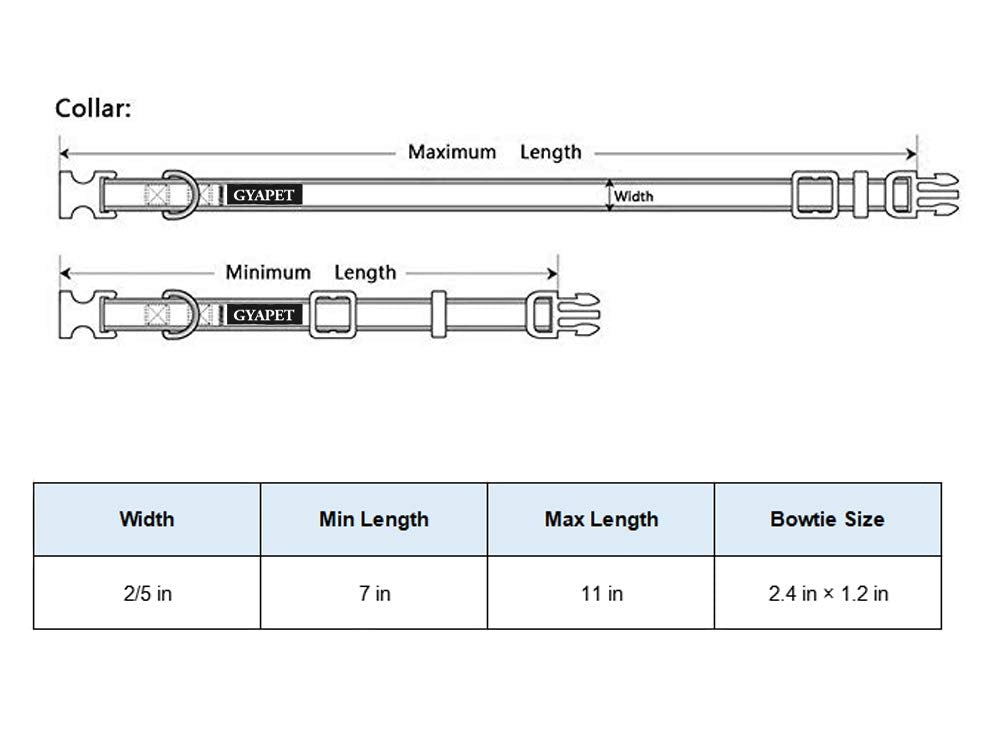 Product Information: Sizing and Fit: please use a soft tape measure or piece of string and wrap it snugly around the base of your pet’s neck, make sure if the collar can fit your pet or not. Your pet’s measured neck size must fit within the collar’s adjustable length range. 0.4” inch width, 7'-11' inches in adjustable length. Features: Basic pure color breakaway cat collar, light plastics breakaway & adjustable buckle, metal D-ring with a bell. Double-later bowtie, adjustable and detachable. Function: Pet fashion collar for daily or used as decoration. Note: Please measure the neck girth of your cat and have a reference before your purchase according to the size information from us. Please wash it by hand and do not iron. *Gyapet has been focusing on the quality and design for your lovely pets. Bringing comfprtable experience for pets is always our aim. More love, more focus, more comfort.