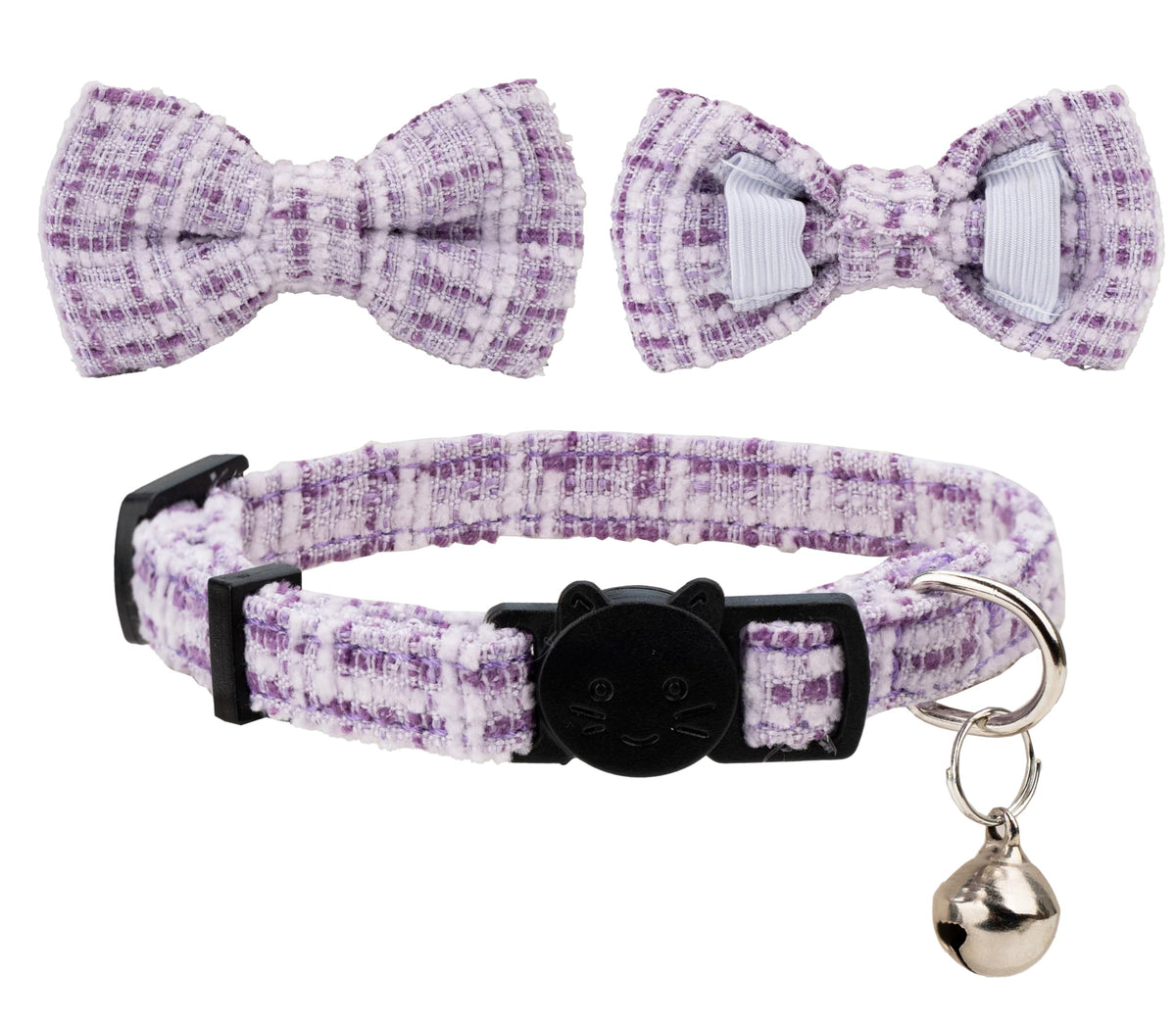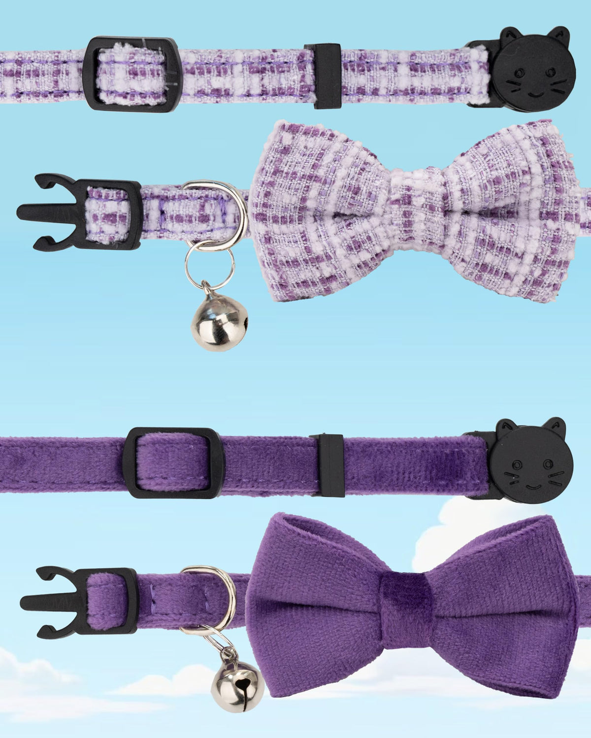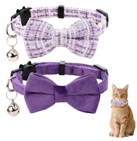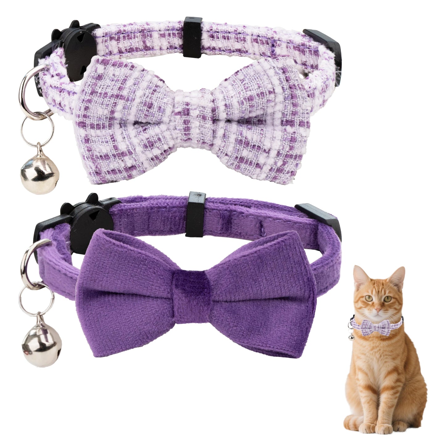 Gyapet Cat Collar Breakaway With Bell Boy Girl Kitten Bow Tie Safety Plaid Solid Color Set Cute Soft Summer B-[2Pcs] Purple