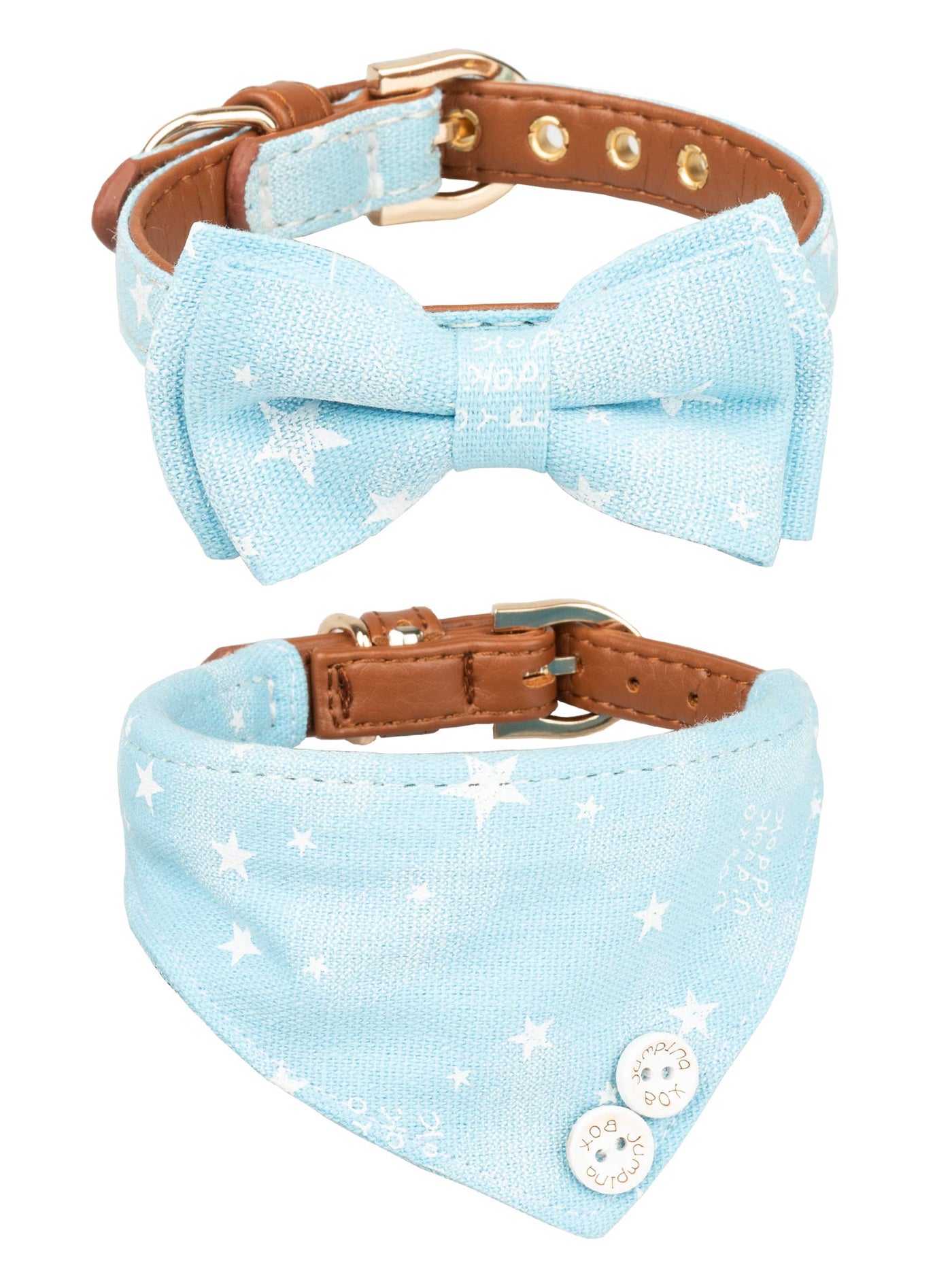 Gyapet Small Dog Collar Puppy Cat Tiny Pet Bow Tie & Bandana 2Pcs Set Pu Leather Canvas Scarf Durable Blue Stars