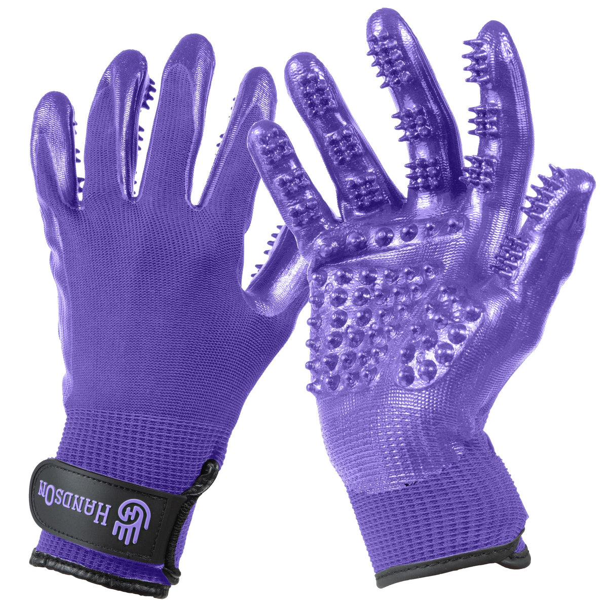 H Handson Pet Grooming Gloves - Patented #1 Ranked, Award Winning Shedding, Bathing, & Hair Remover Gloves - Gentle Brush For Cats, Dogs, And Horses (Mono Purple, Small)