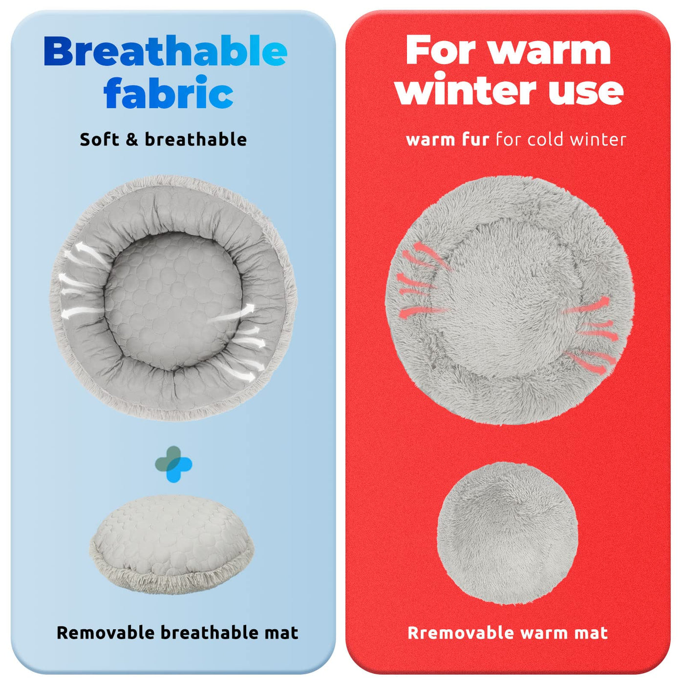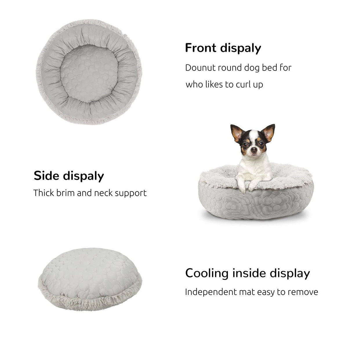 NO MORE HOT: HAcHIKITTY donut dog bed is made of cooling fabric keep your dog cool in this summer no more hot Double-sided usable design with thickened warm fluff on one side and smooth polyester on the other You can choose the suitable side for the dog to use according to the temperature change which is very user-friendly SOFT & cOMFORTABLE: This Dog calming Donut Bed is made of safe and skin-friendly material this dog donut bed for medium large dogs is filled with over 22-75lbs polyester polyester inside surrounded by a raised circle to support the pets body and a soft round cushion in the middle creating a soft and comfortable leisure area for the petMake sure your pets will love it gOOD SLEEP EXPERIENcE: Our plush soft donut dog bed is fully padded with polyester and is not easily deformed providing effective support for the dogs head and neck The fluffy front and polyester back are cozy and skin-friendly providing a comfortable sleeping environment and a good sleep experience for your dog HYPOALLERgENIc DOg BED: This dog donut bed for medium large dogs is made of non-toxic materials safe in the washing machine - Machine wash gentle cycle air dry We usually recommend hand washing Easy care for the bed will keep a comfortable and clean sleeping space for our friends cHOOSE SUITABLE SIZE: Available in three sizes The 243036 inch Donut dog bed is suitable for dogs or cats of any age and weighing up to 2545100 lbs Please measure your pets weight before purchasing to avoid inappropriate