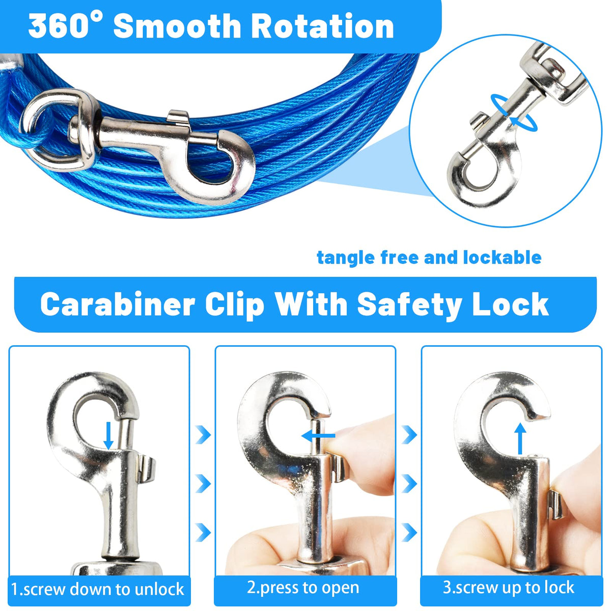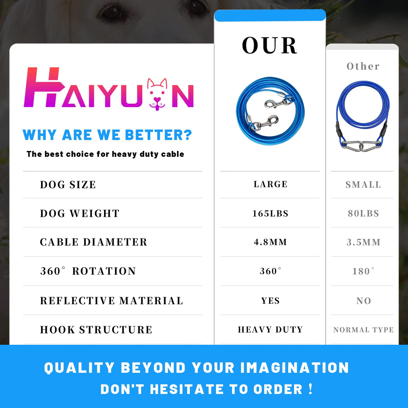STURDY DOg TIE OUT cABLE:The HaiYUAN multi-functional multi-size ultra-tensile pull cable provides greater range of motion for dogs Designed for large medium and small dogs up to 165 lbs DURABLE MATERIAL:The steel cable is very strong wrapped in a soft PVc protection tube durable rust-proof high-strength anti-bite not easy to be torn by the dog and can be used for a longer period of time ADVANcED cLIP:The rotating clip can rotate 360A to provide more room for your dog to move around without getting tangled up Also prevent your pet from breaking free from the cable and running into danger UPgRADED & THIcKENED STEEL RINgS: Both ends of the cable are pressed by upgraded and thickened steel rings which are more durable and effectively solve the risk of falling off Bring the safest protection to your fur baby WIDE RANgE OF APPLIcATION: In camping parks courtyards gardens and other outdoor activities you can use this dog cable to protect your pet It is convenient to carry and can be stored in the carrying bag
