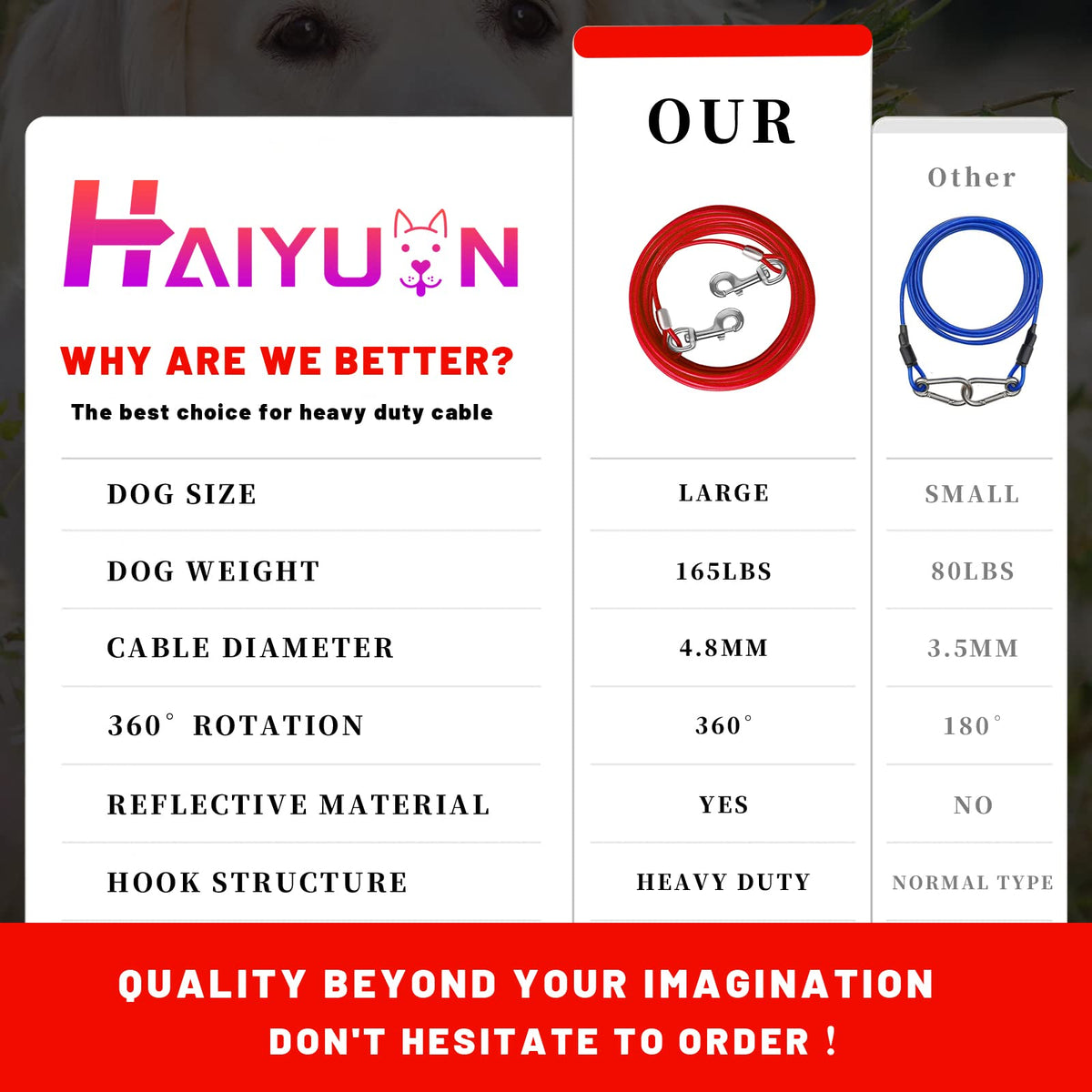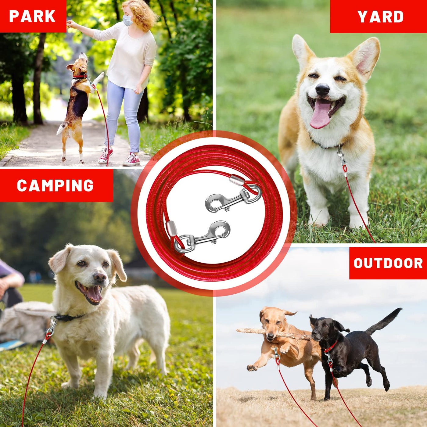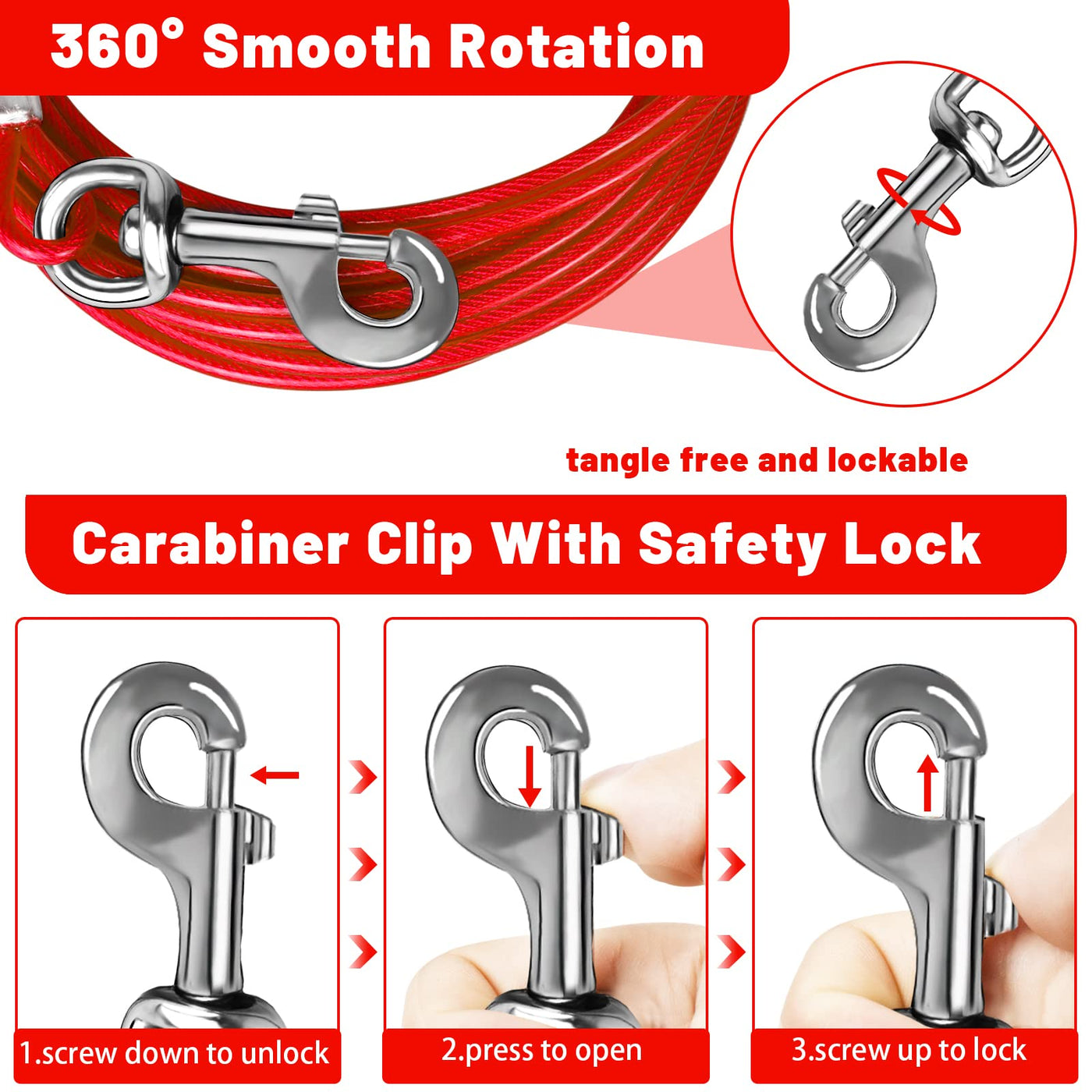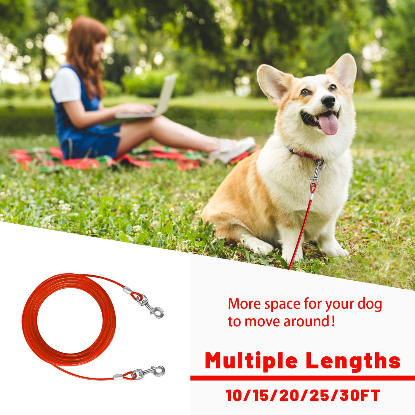 STURDY DOg TIE OUT cABLE:The HaiYUAN multi-functional multi-size ultra-tensile pull cable provides greater range of motion for dogs Designed for large medium and small dogs up to 165 lbs DURABLE MATERIAL:The steel cable is very strong wrapped in a soft PVc protection tube durable rust-proof high-strength anti-bite not easy to be torn by the dog and can be used for a longer period of time ADVANcED cLIP:The rotating clip can rotate 360A to provide more room for your dog to move around without getting tangled up Also prevent your pet from breaking free from the cable and running into danger UPgRADED & THIcKENED STEEL RINgS: Both ends of the cable are pressed by upgraded and thickened steel rings which are more durable and effectively solve the risk of falling off Bring the safest protection to your fur baby WIDE RANgE OF APPLIcATION: In camping parks courtyards gardens and other outdoor activities you can use this dog cable to protect your pet It is convenient to carry and can be stored in the carrying bag