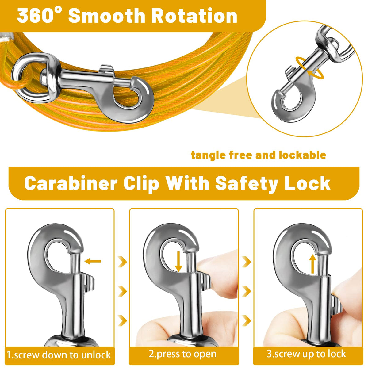 STURDY DOg TIE OUT cABLE:The HaiYUAN multi-functional multi-size ultra-tensile pull cable provides greater range of motion for dogs Designed for large medium and small dogs up to 165 lbs DURABLE MATERIAL:The steel cable is very strong wrapped in a soft PVc protection tube durable rust-proof high-strength anti-bite not easy to be torn by the dog and can be used for a longer period of time ADVANcED cLIP:The rotating clip can rotate 360A to provide more room for your dog to move around without getting tangled up Also prevent your pet from breaking free from the cable and running into danger UPgRADED & THIcKENED STEEL RINgS: Both ends of the cable are pressed by upgraded and thickened steel rings which are more durable and effectively solve the risk of falling off Bring the safest protection to your fur baby WIDE RANgE OF APPLIcATION: In camping parks courtyards gardens and other outdoor activities you can use this dog cable to protect your pet It is convenient to carry and can be stored in the carrying bag