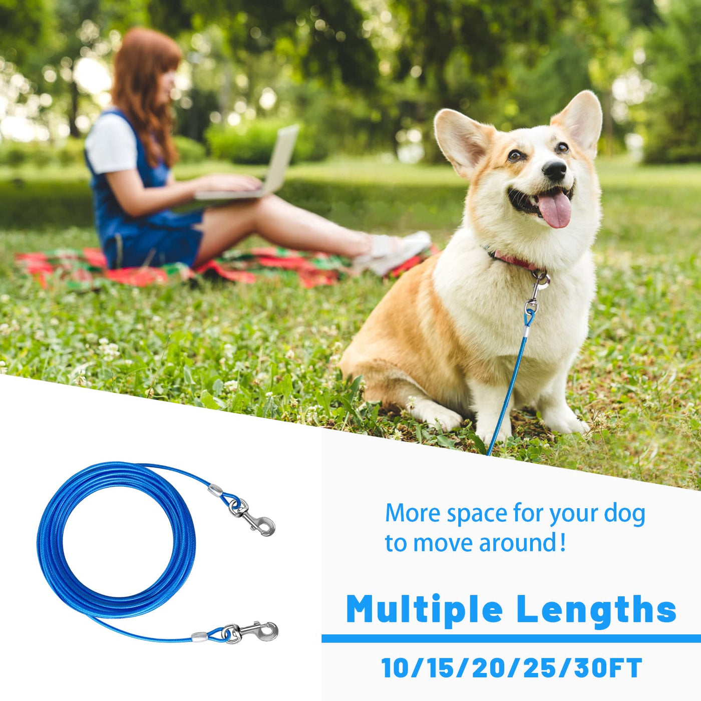 STURDY DOG TIE OUT CABLE:The HaiYUAN multi-functional, multi-size, ultra-tensile pull cable provides greater range of motion for dogs. Designed for large, medium and small dogs up to 165 lbs. | DURABLE MATERIAL:The steel cable is very strong, wrapped in a soft PVC protection tube, durable, rust-proof, high-strength anti-bite, not easy to be torn by the dog, and can be used for a longer period of time. | ADVANCED CLIP:The rotating clip can rotate 360° to provide more room for your dog to move around without getting tangled up. Also prevent your pet from breaking free from the cable and running into danger. | UPGRADED & THICKENED STEEL RINGS: Both ends of the cable are pressed by upgraded and thickened steel rings, which are more durable and effectively solve the risk of falling off. Bring the safest protection to your fur baby. | WIDE RANGE OF APPLICATION: In camping, parks, courtyards, gardens and other outdoor activities, you can use this dog cable to protect your pet. It is convenient to carry and can be stored in the carrying bag.