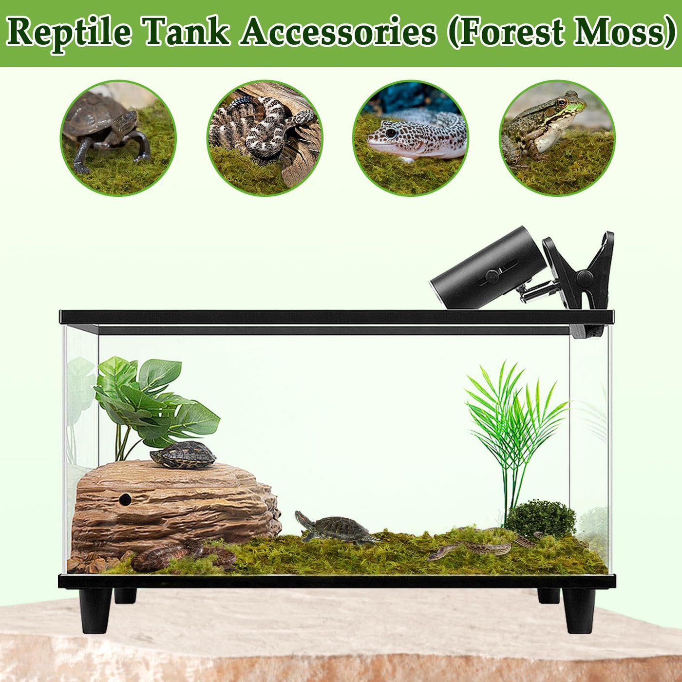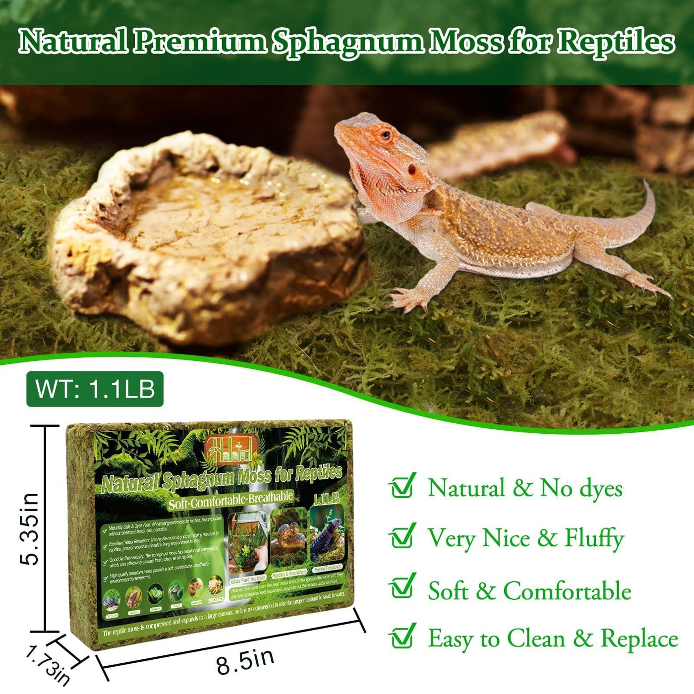Natural Sphagnum Moss For Reptiles, Providing A Soft, Comfortable Living Environment For Your Lovely Reptiles, Such As Leopard Gecko, Lizards, Snakes Bearded Dragon And Turtles. Specifications: Material: High Quality Natural Sphagnum Moss Color: Natural Green Features: Safe, No Dyes, Excellent Humidity Retention & Breathability