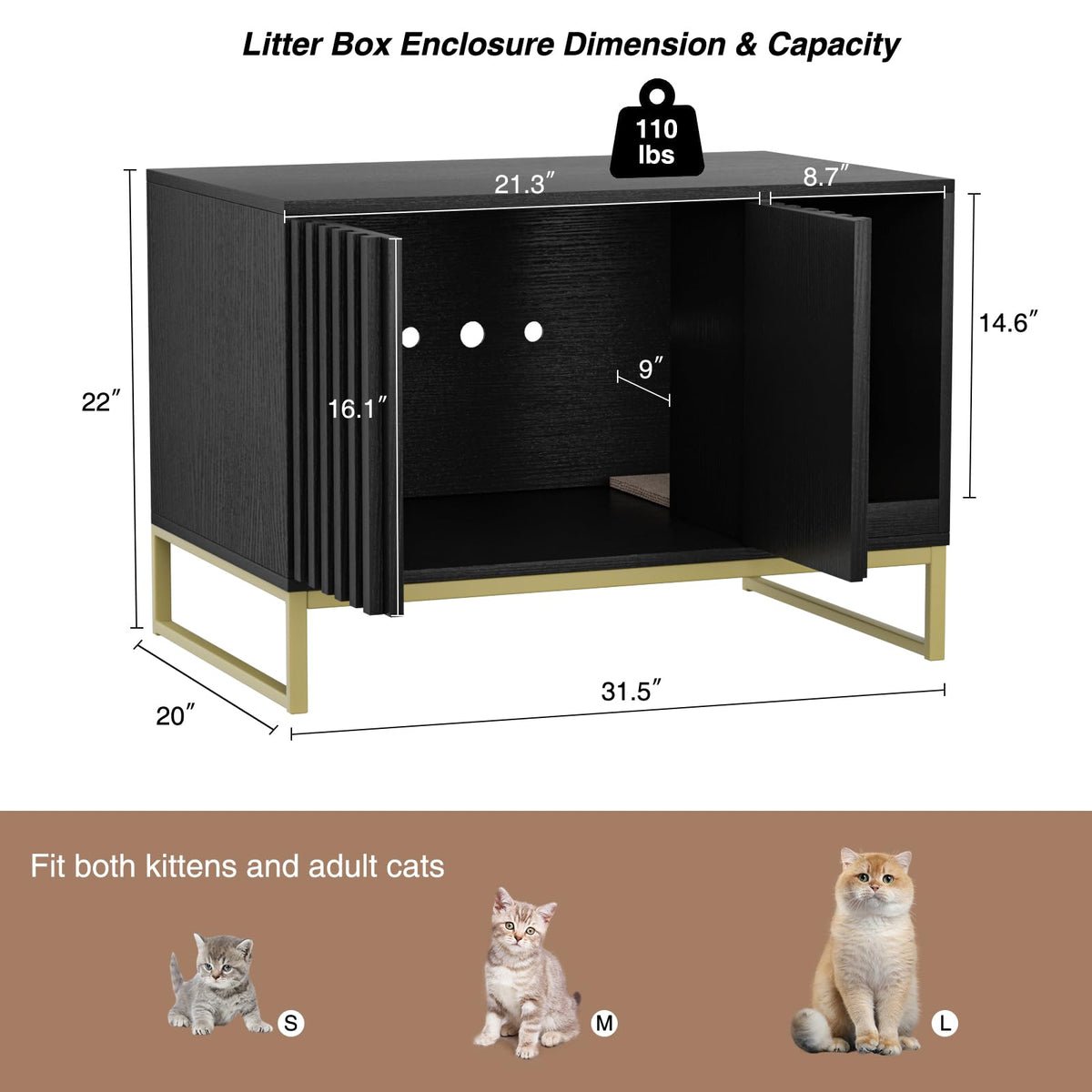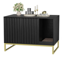 Features -Hidden Cat Litter Box Furniture Features A Mix Of Solid Wood-Effect Finish,Gold-Finished Iron And Thick Solid Fluted Panels. -Its Enclosed Design With Ventilation Holes Ensures That Odors Are Contained. -Our Multi-Functional Cat Litter Box Enclosure Is Designed With A Spacious Countertop,Enough To Resting For Cats Or Storage Something. -With Back Panel Fixing Accessories To Increase The Stability Of The Cat House. -The Cat Litter Box Furniture Boasts A Thoughtful Double Pop-Up Door Design,Make It Easier For Clean It. -The Raised Bottom Design Is Perfect For Cleaning Robots To Enter. -Litter Box Enclosure Furniture Entrance Built-In Scratching Board Provides An Area For Cats To Sharpen Their Claws. -Winding Entrance In Litter Box Cat House Gives Cats Room To Explore.