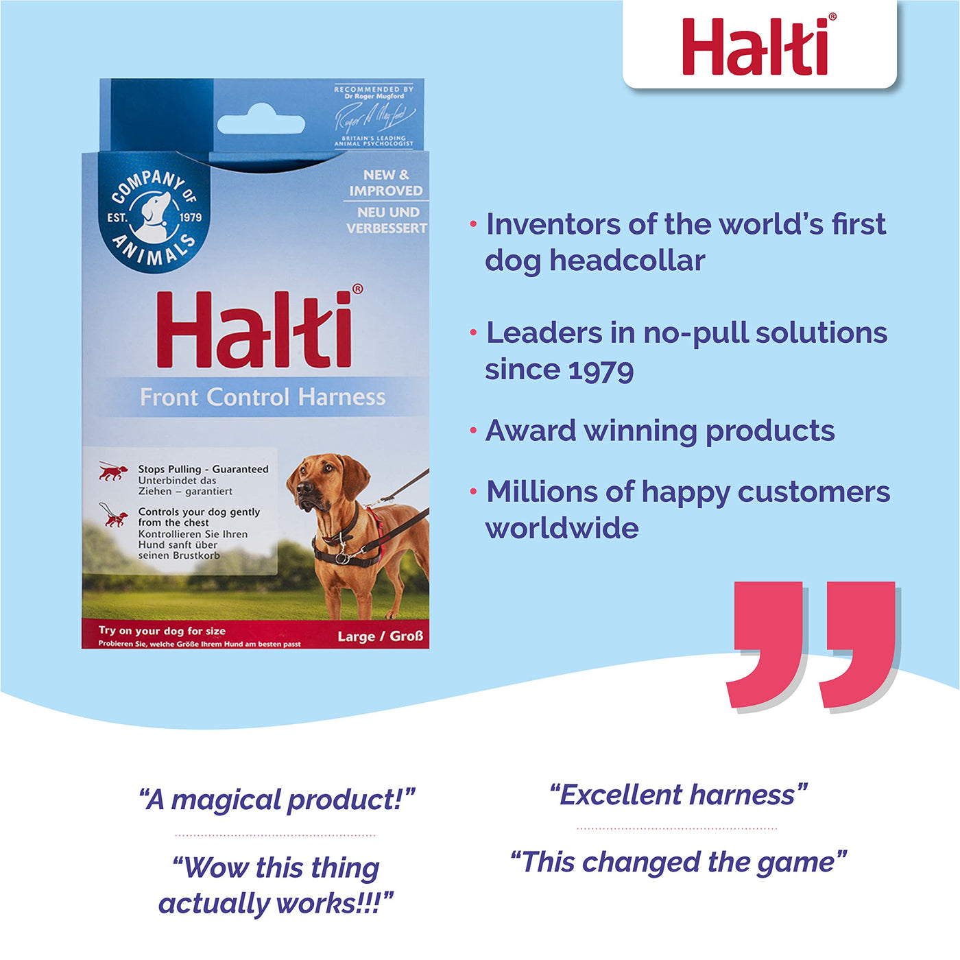 STOPS PULLINg: the Halti Front control Harness steers the dog from the chest and shoulders ensuring improved control with even the strongest pullers KIND & HUMANE: the lightweight design and neoprene padding on the shoulder straps ensures maximum comfort at all times PERFEcT FIT: the Halti Front control Harness is easily adjustable offering a comfortable solution for all sizes of dog SAFE: featuring a strong safety clip that attaches to your dogs collar for complete peace of mind BETTER TOgETHER: to get the best no pull training experience use the Halti Front control Harness with our double clip Halti Training Lead