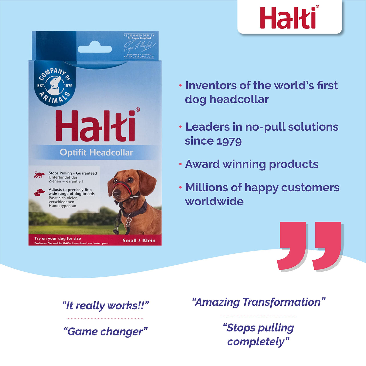 The HALTI OptiFit is a complete training program designed by Dr. The pack includes a HALTI OptiFit Headcollar, a comprehensive Instruction Guide, and a HALTI safety link which connects to the dogs’ collar for extra security. Specially designed to provide an ergonomic and comfortable fit, the adjustable chin-strap with secure camlock, allows a customized fitting for every dog. The uniquely styled cheek straps, which follow the contours of a dogs face, stop the OptiFit rising into the dogs eyes or sliding down to his lips (flews). Additional padding on the noseband, ensures extra comfort and reflective webbing on the side strips help provide additional visibility. Designed to fit most dogs from short nosed Boxers to long nosed Borzoi's, the HALTI OptiFit provides maximum comfort and optimum fit no matter what the shape or size.