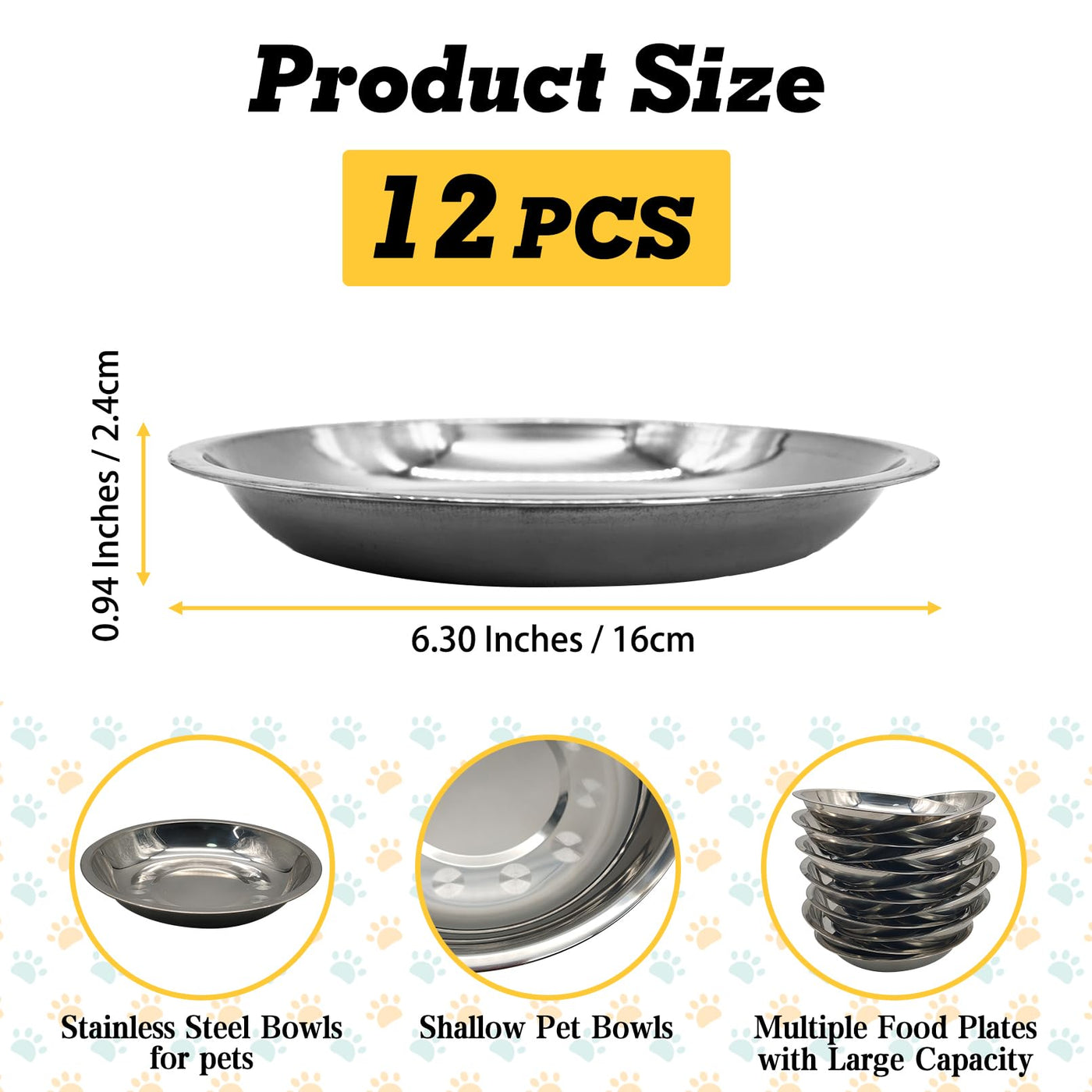 FEATURES1. The stainless steel cat tray has a low and wide shape, making it easy to feed. This shallow design also helps to relieve cat whiskers fatigue and avoid them from overstimulating the sensory system of the whiskers when they touch the bowl during feeding2. The good quality stainless steel bowls are safe for pets with a smooth surface that are easy to clean and last a long time. If there are many kittens or puppies at home, then these cat bowls are one of our suitable choices for you, stainless steel material without worrying about breaking3. The bottom of the bowl has a large contact area and is not easy to knock over. If you want to secure the bowl, you can use a silicone pad to avoid it from moving during use, or use a bowl holder to secure itPackage Include: 12 Pcs stainless steel pet bowlsMaterial: Stainless SteelProduct Size: 8.67L x 8.67W x 1.22HPlease Note1. Due to manual measurement, please allow an error of 1-3 cm2. Due to the difference between different monitors, the picture may not reflect the actual color of the project, please refer to the actual product