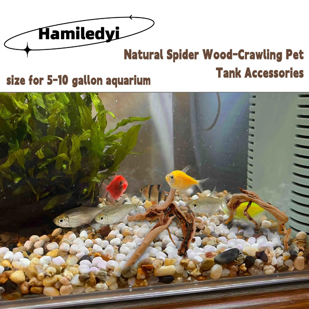 Q: What makes the Hamiledyi Driftwood unique compared to other aquarium decorations?A: The Hamiledyi Driftwood is made of high-quality, natural wood that offers realistic beauty and unique shapes, enhancing the aesthetic value of your aquarium. Each piece is carefully selected for durability and may vary in shape and color, making every purchase distinct.
