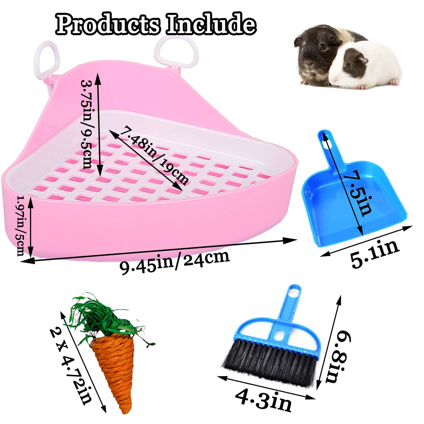 Hamiledyi Small Pets Triangle Potty Trainer Corner, Specially Designed For Small Pets, The Middle Partition Can Be Easily Taken Out, Not Stuck Feet, Will Not Slide. The Round Buckle Will Keep The Toilet In The Corner Of The Pet'S Cage, So It Won'T Run Around.Easier To Cleanthe Middle Partition Mesh Is Larger, The Smooth Hole Will Not Get Stuck Small Animals, Small Pets On The Toilet Can Easily Leak Into The Groove Below, The Owner Is More Convenient In Cleaning.Round Buckle Designall You Have To Do Is Put The Toilet In Place, Button It, And It Stays In Place. Ordinary Toilets Are Held In Place By Hooks, And If The Cage Design Is Defective, It Cannot Be Hung. The Buckle Design Is Easy To Use.Features: 1. The Material Is Safe, Strong And Durable, Stable And Anti-Skid. 2. There Is A Baffle On The Back To Prevent Urine Spatter. There Is A Certain Space Of The Urinal And A Large Carrying Space. 3. Easy To Clean The Material, Can Reduce The Host Cleaning Times. 4. Provide Your Pets With Their Favorite Chewable Snacks To Relieve Their Stress. 5. Take Up Less Space And Leave More Space For Pets To Play. Products Include:1*Guinea Pig Litter Box Corner5*Sweet Bamboo1*Broom And Dustpan2*Chew Carrotnote: Please Confirm The Size Before Purchase.