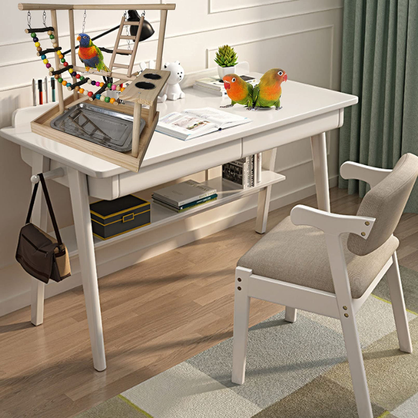 Q: What is the size of the Hamiledyi Parrots Playground, and is it portable?A: The dimensions of the Hamiledyi Parrots Playground are 14.5 inches in length, 9.8 inches in width, and 15.7 inches in height. Its compact size makes it portable and suitable for placement on a desk or table, allowing you to easily move it around your home.