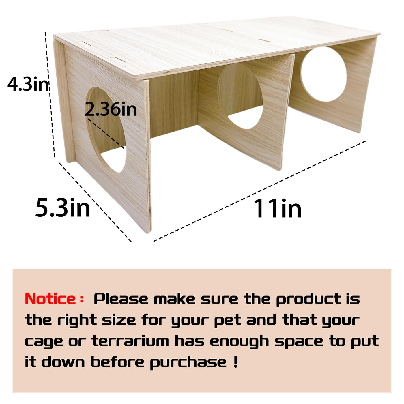 hamster hideout Natural material: The wooden hideout tunnel is made of solid wood material, which is natural and harmless to the health of hamsters. Good ventilation performance: The wooden hideout maze has good ventilation performance, which helps to keep the hamster comfortable and breathing smoothly. Good ventilation can effectively prevent moisture, thus protecting the health of hamsters. Sturdy and full of space: The wooden hideout is sturdy in construction and provides plenty of space for the hamster to move around and explore. The spacious space is beneficial for hamsters, allowing them to do moderate exercise and set up a variety of rich toys and rides. Warm in winter and cool in summer: Solid wood material has thermal insulation and cold performance, but also has good thermal insulation effect. This allows the wooden hideout tunnel to be warm in the winter and relatively cool in the summer, providing a comfortable living space for the hamster. Easy to observe: The two-room perspective design allows the owner to easily observe the life status of the hamster, such as eating, resting and so on. This design not only increases the enjoyment of breeding, but also helps the owner to detect abnormal behavior or health problems of the hamster in time. Beautiful and easy to integrate into the cage: Wooden hideout tunnel are beautiful in appearance and can be well integrated into the hamster cage, increasing the overall beauty of the cage interior. Bottomless design: Bottomless design eliminates the adsorption of urine on the bottom, making cleaning easy. It has also adapted to the hamster's habit of burrowing, which can be used to hide or to dig down. Our hamster hideout comes in three sizes, the smallest size is suitable for small hamsters like dwarf hamsters, the medium size is suitable for slightly larger hamsters like flower twigs, and the large size is suitable for guinea pigs.