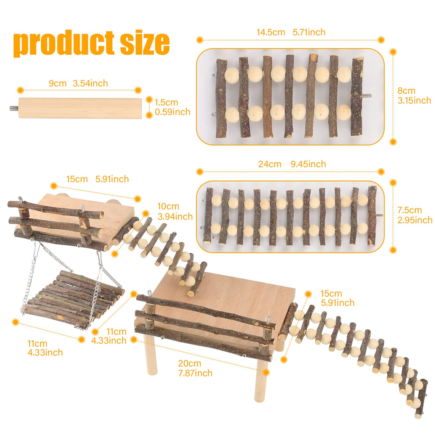 Q: How do I maintain and clean the wooden climbing toys?A: To maintain the Hamster Climbing Toys, regularly check for any chew marks or wear. You can clean the wooden surfaces with a damp cloth. Avoid using harsh chemicals to ensure the safety of your pets. Ensure the toys are fully dry before placing them back in the cage.