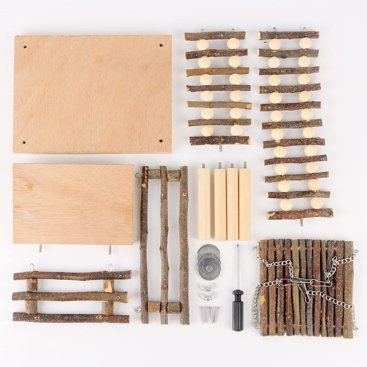Q: How do I install the Hamster Climbing Toys?A: The Hamster Climbing Toys come with removable components that are easy to install. Each part is equipped with screws, and you can assemble them manually. The ladder can be placed directly against the hole, while the fence needs to be drilled and installed with the provided screwdriver. The platform with the swing can be adjusted to your desired height.
